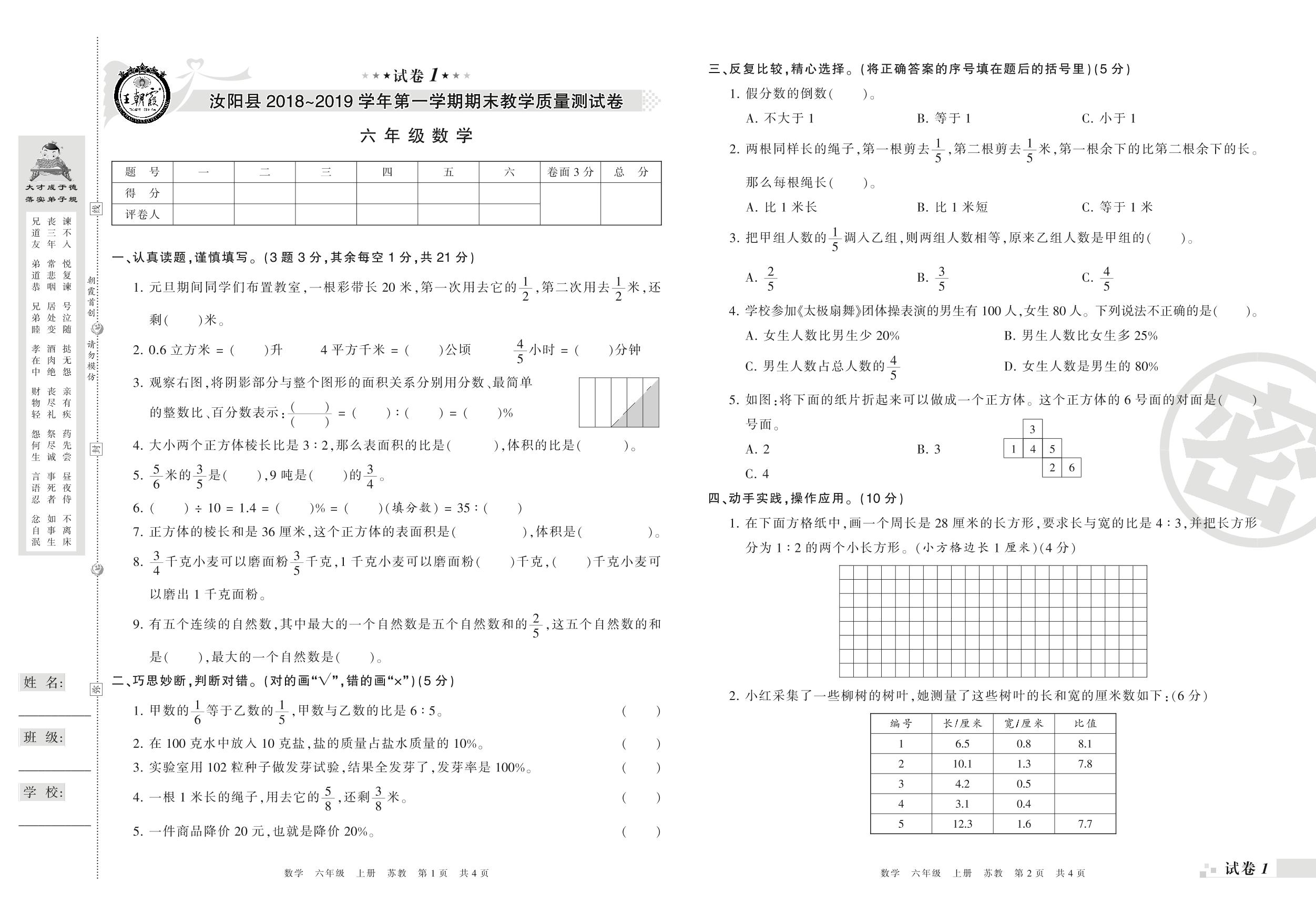 2018-2019学年第一学期洛阳市汝阳县六年级数学试卷(苏教版)【1】