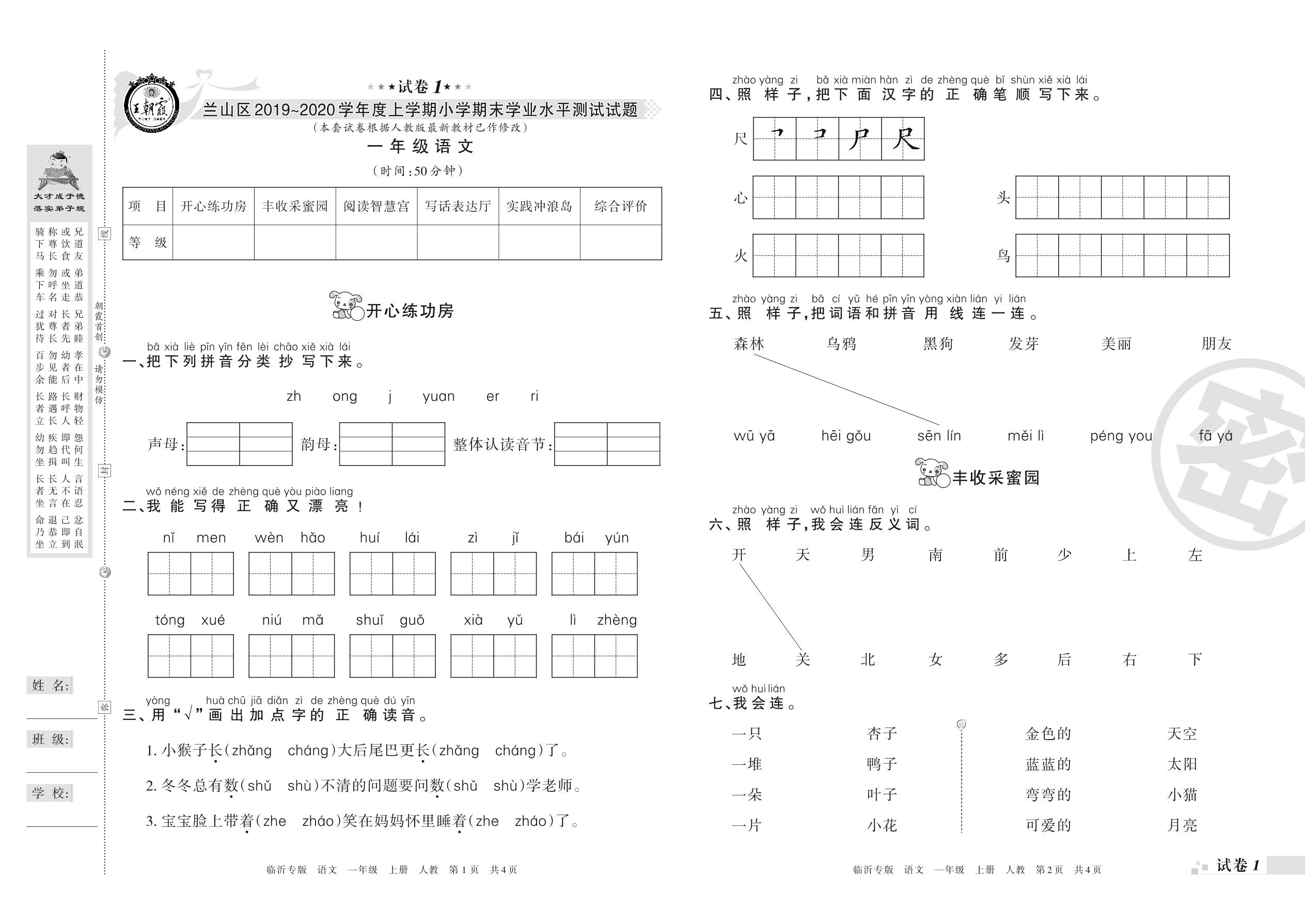 2019-2020学年第一学期临沂市兰山区一年级语文试卷(人教版)【1】