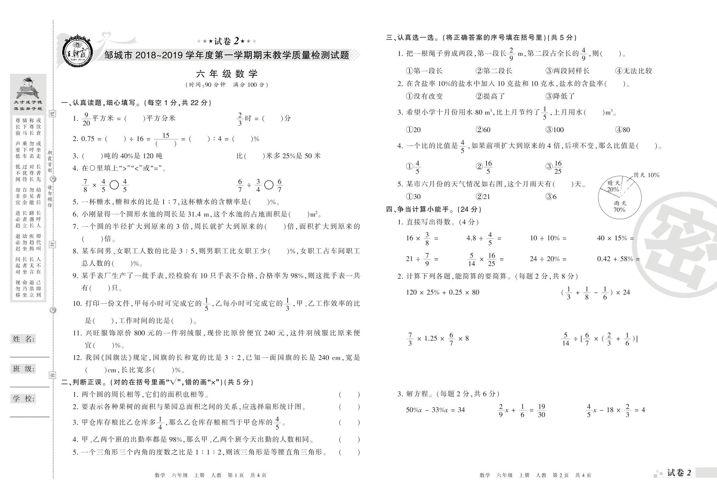 2018-2019学年第一学期邹城市六年级数学试卷(人教版)【2】