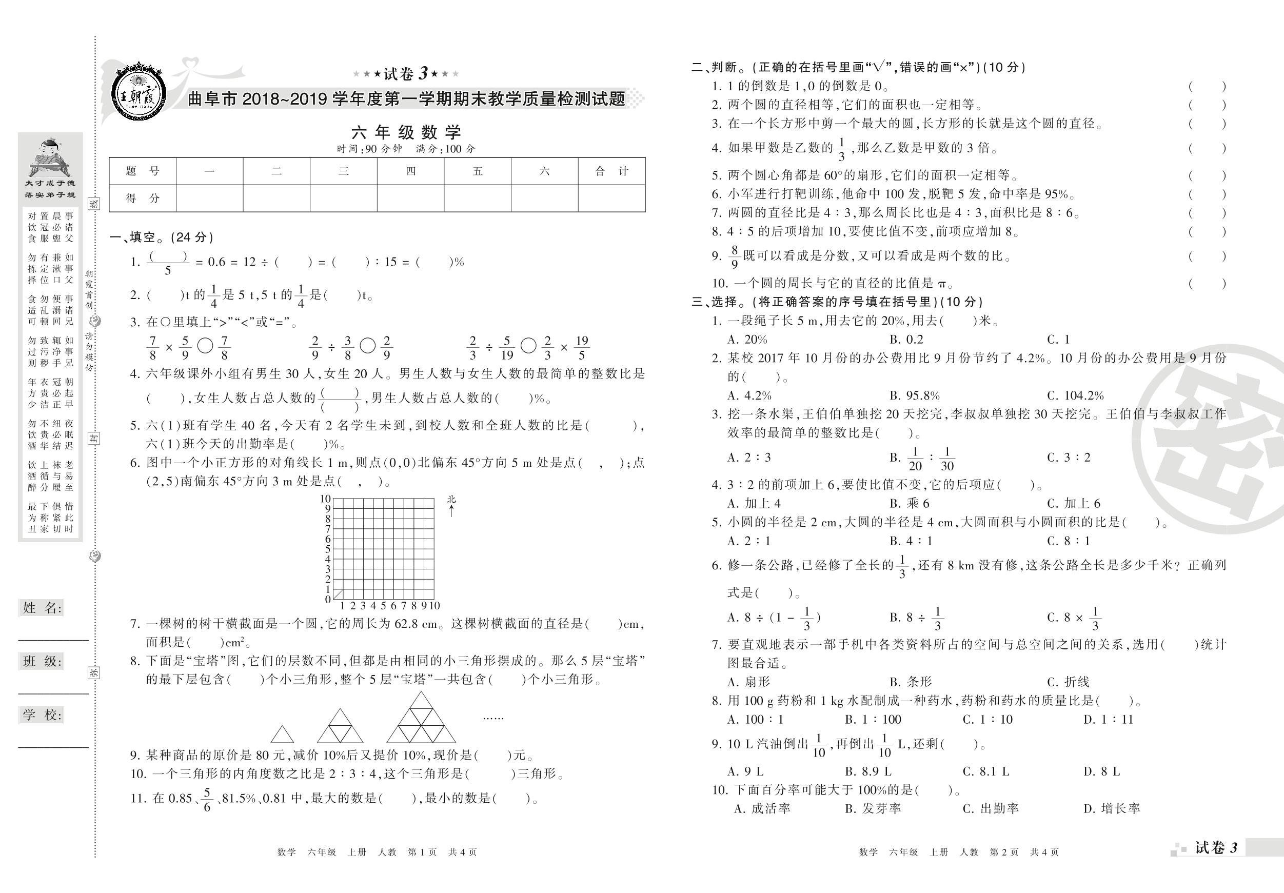 2018-2019学年第一学期曲阜市六年级数学试卷(人教版)【3】