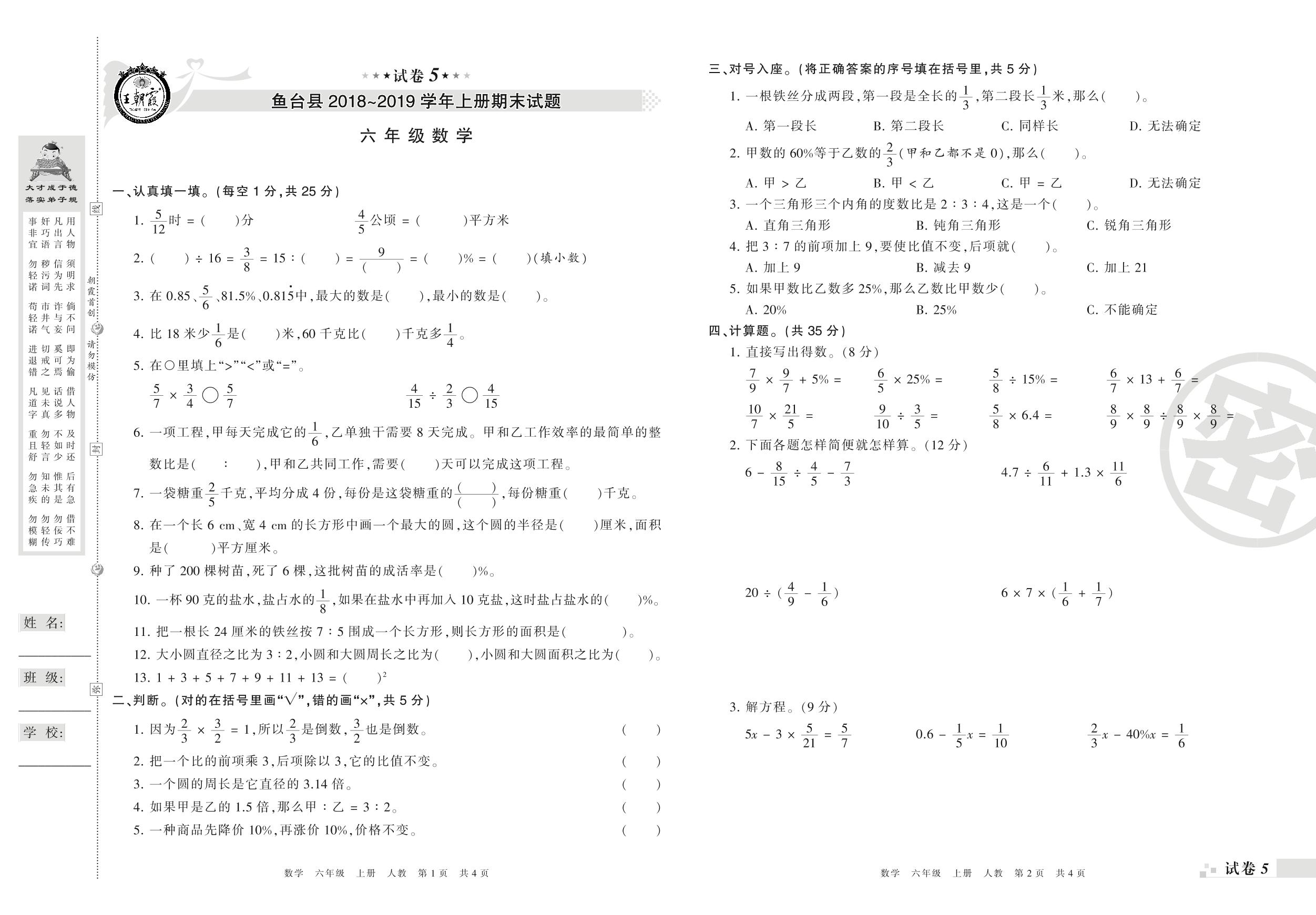 2018-2019学年第一学期济宁市鱼台县六年级数学试卷(人教版)【5】