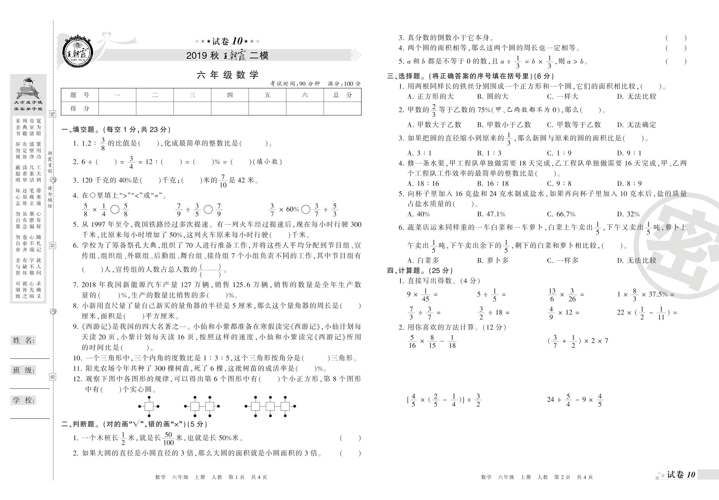 王朝霞期末模拟卷六年级上册数学(人教版)_R21080595159【10】