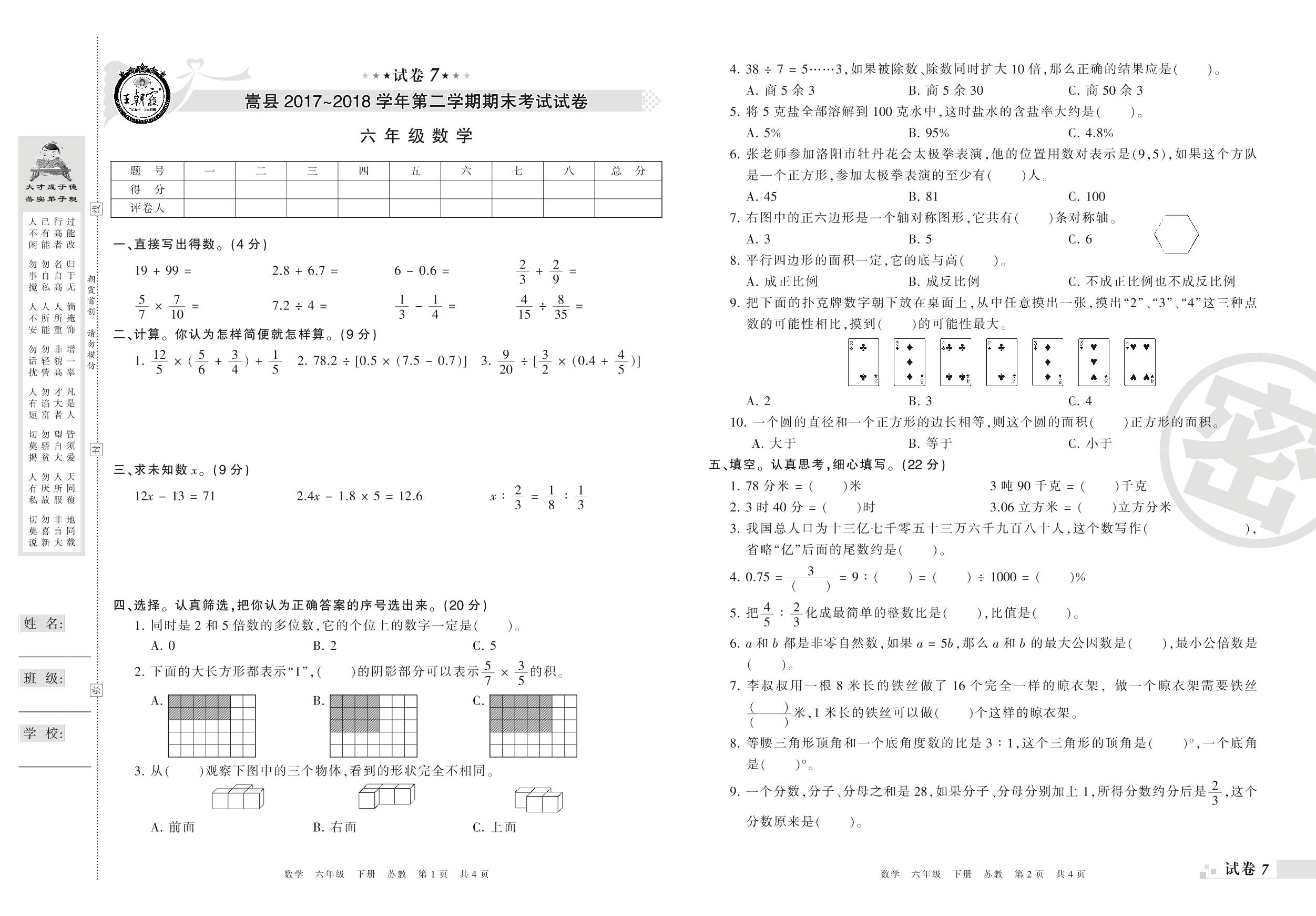 2017-2018学年第二学期洛阳市嵩县六年级数学试卷(苏教版)【7】
