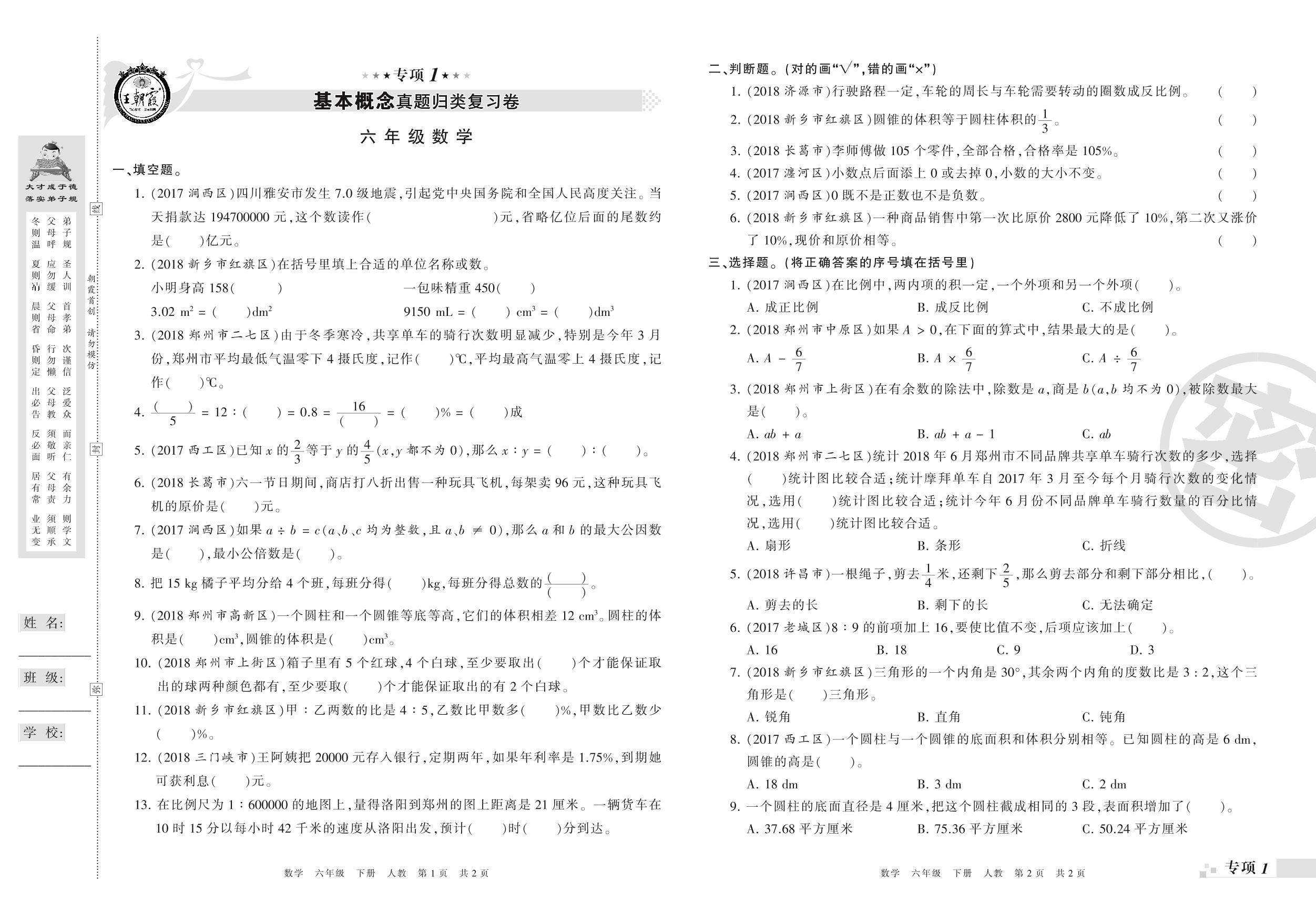 王朝霞期末专项卷——基本概念、计算真题归类复习卷六年级下册数学(人教版)_R21080595314【0】