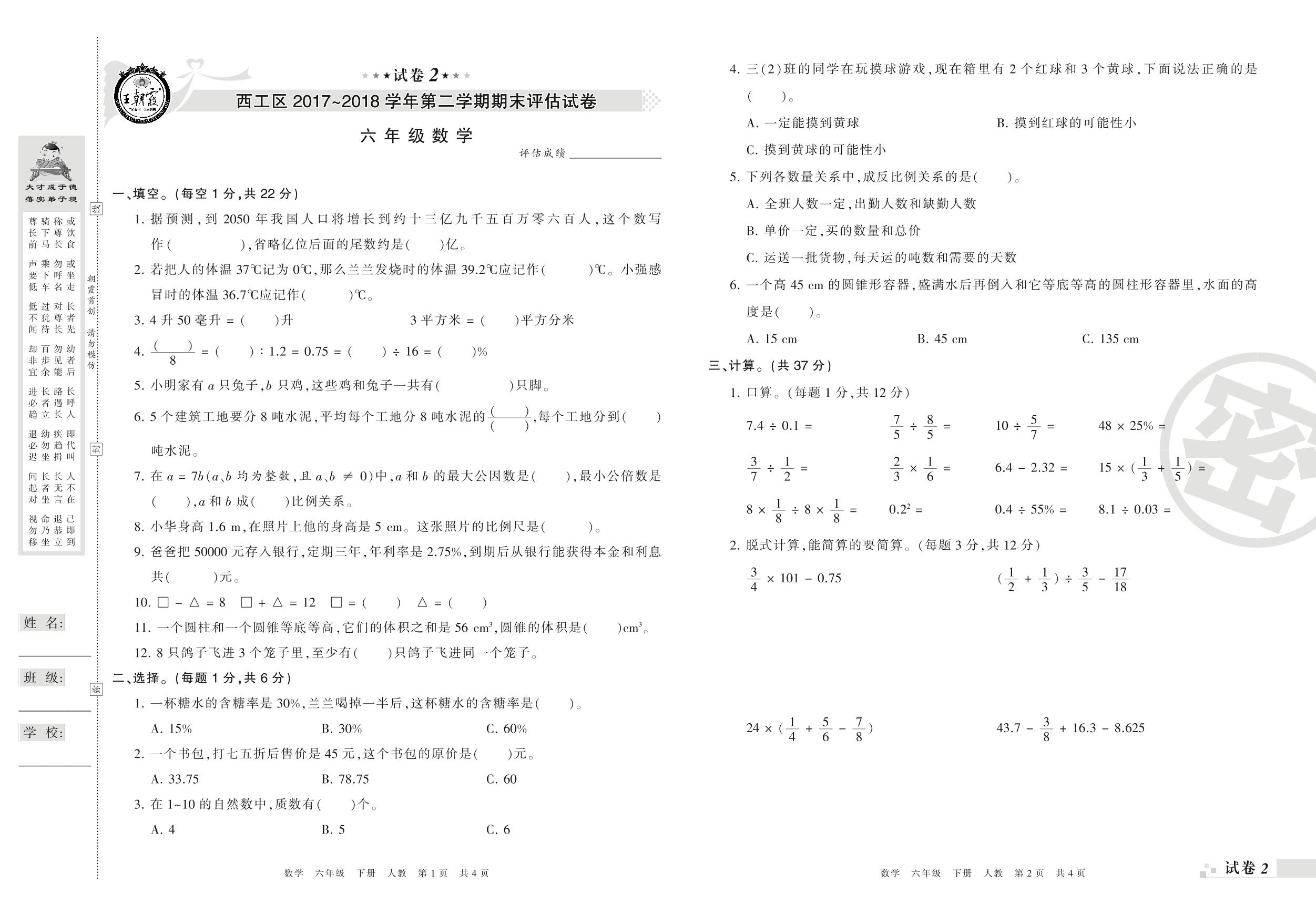 2017-2018学年第二学期洛阳市西工区六年级数学试卷(人教版)【2】