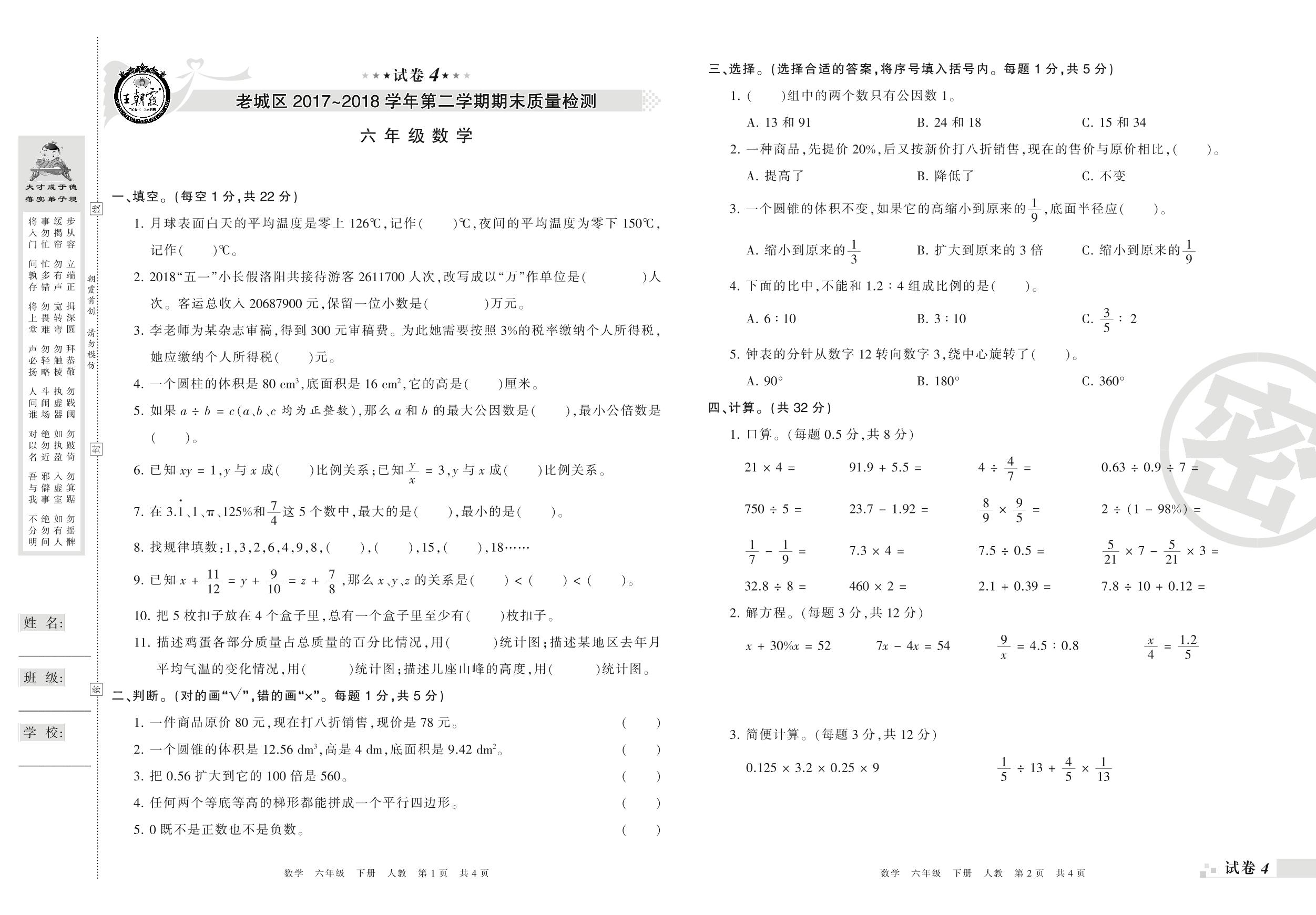2017-2018学年第二学期洛阳市老城区六年级数学试卷(人教版)【4】