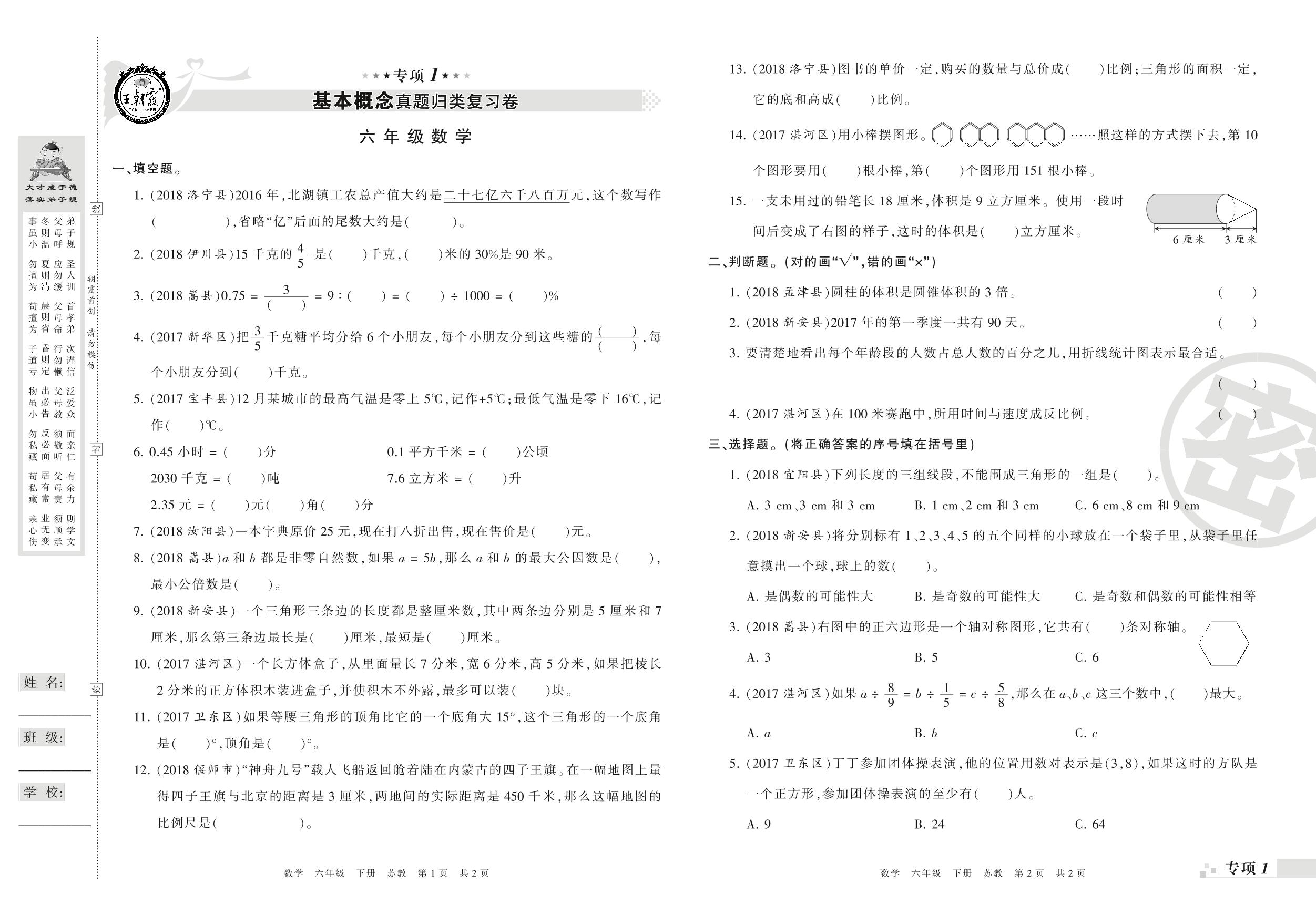 王朝霞期末专项卷——基本概念、计算真题归类复习卷六年级下册数学(苏教版)_R21080595402【0】