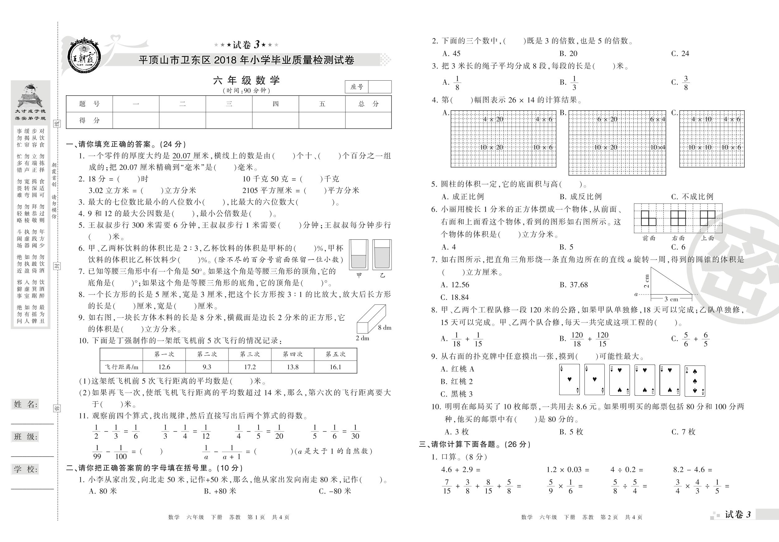 2017-2018学年第二学期平顶山市卫东区六年级数学试卷(苏教版)【3】