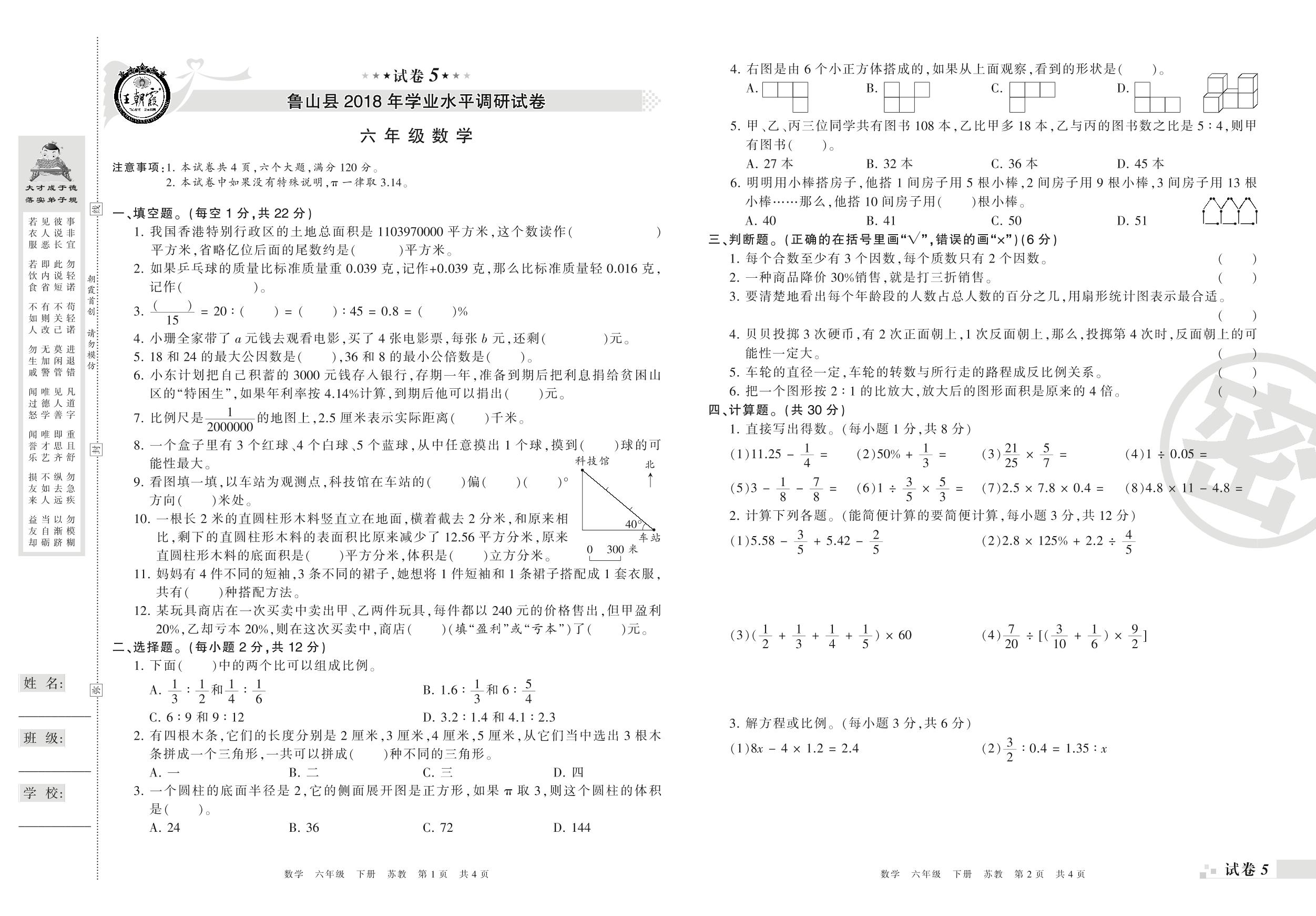 2017-2018学年第二学期平顶山市鲁山县六年级数学试卷(苏教版)【5】