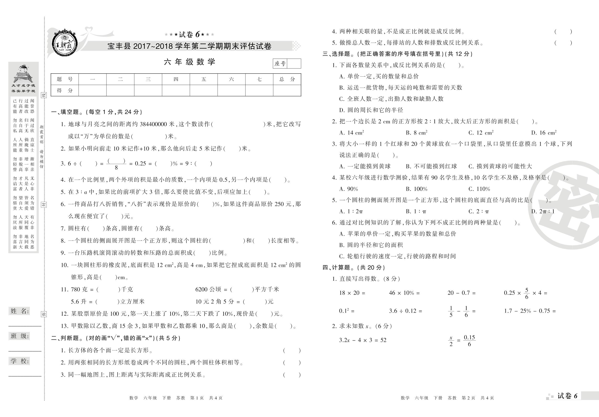 2017-2018学年第二学期平顶山市宝丰县六年级数学试卷(苏教版)【6】