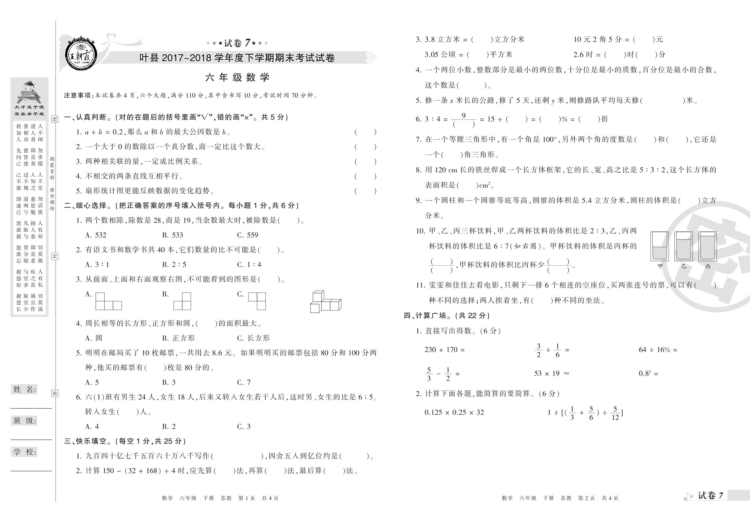 2017-2018学年第二学期平顶山市叶县六年级数学试卷(苏教版)【7】