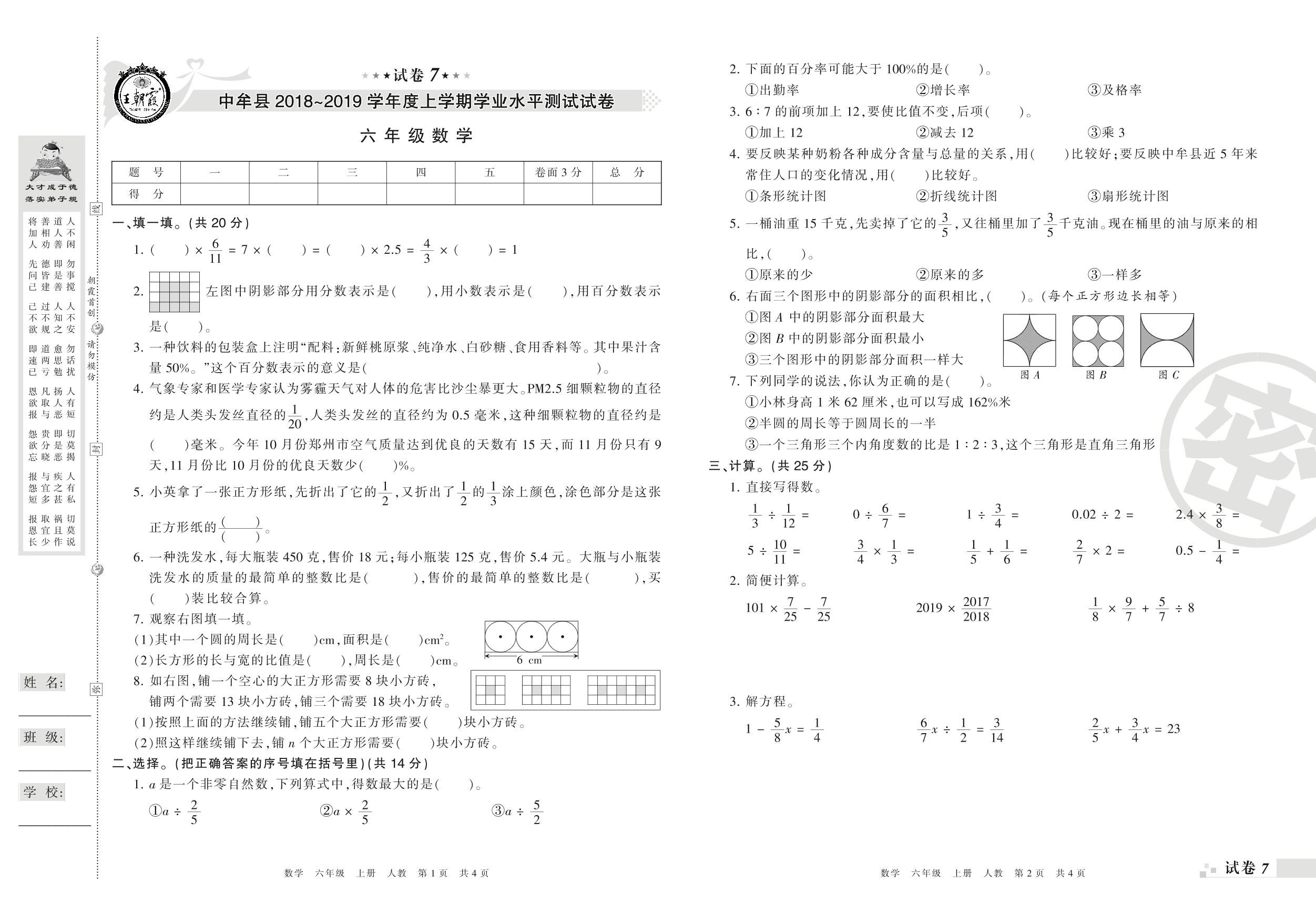 2018-2019学年第一学期郑州市中牟县六年级数学试卷(人教版)【7】