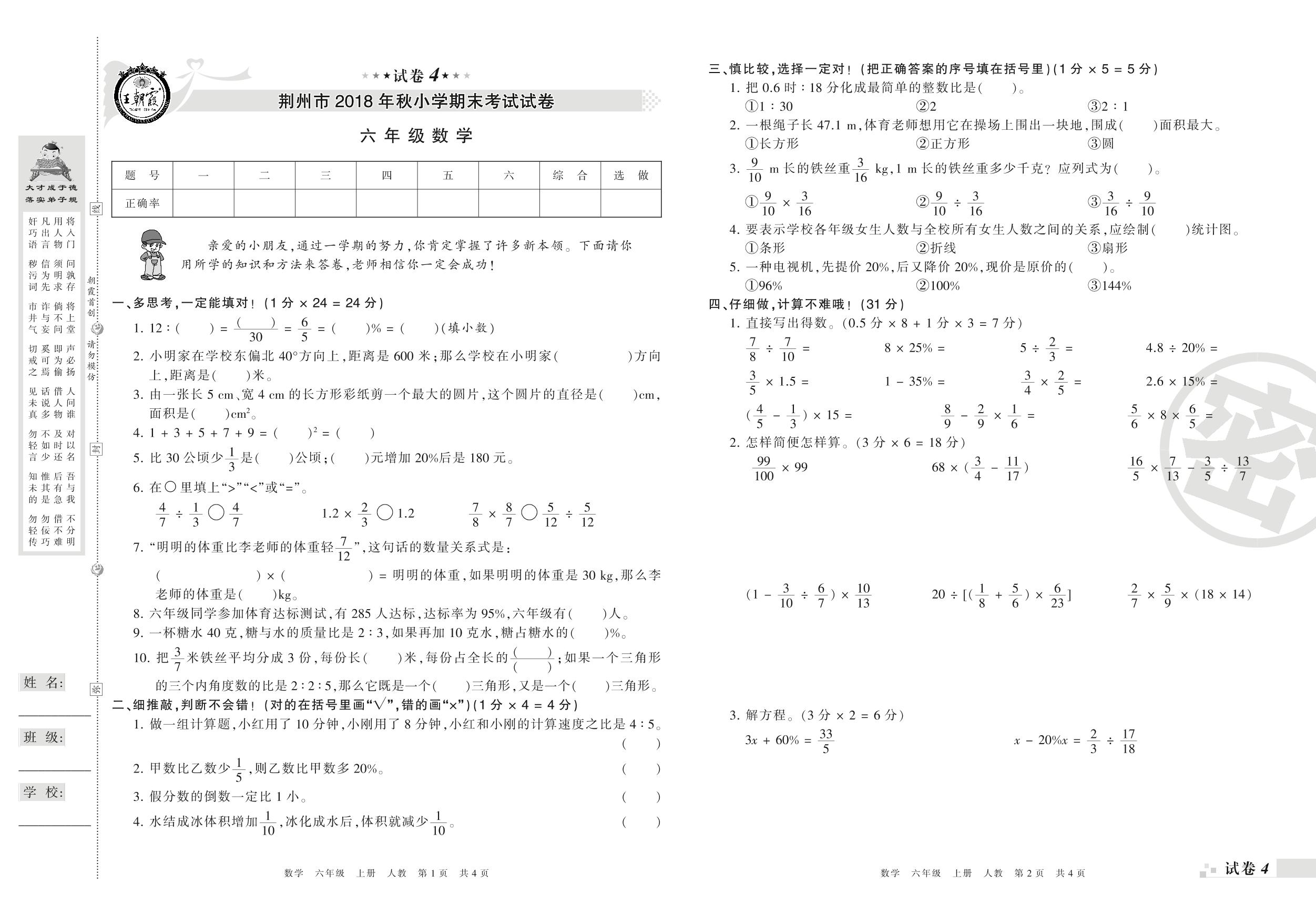 2018-2019学年第一学期荆州市六年级数学试卷(人教版)【4】