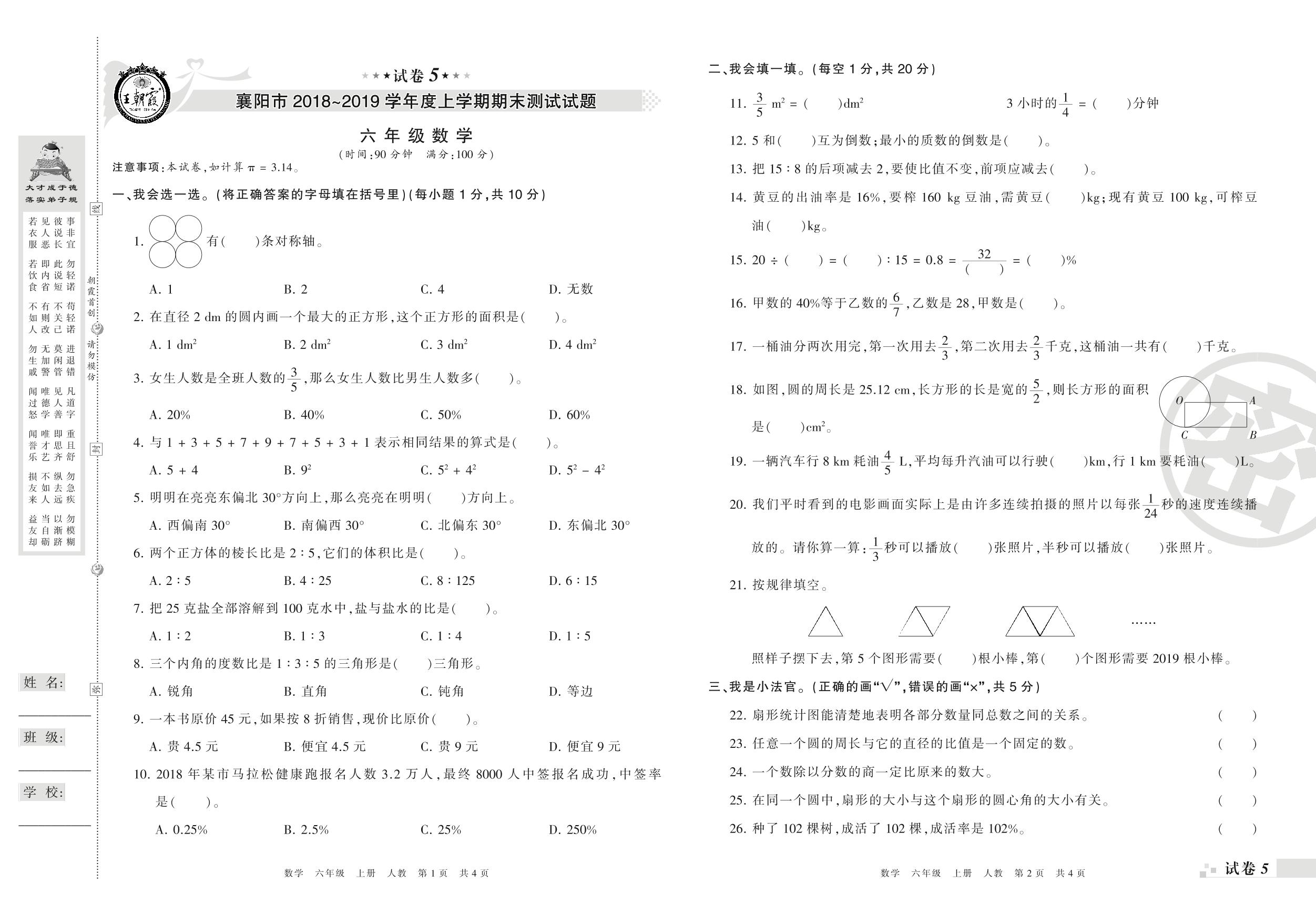2018-2019学年第一学期襄阳市六年级数学试卷(人教版)【5】