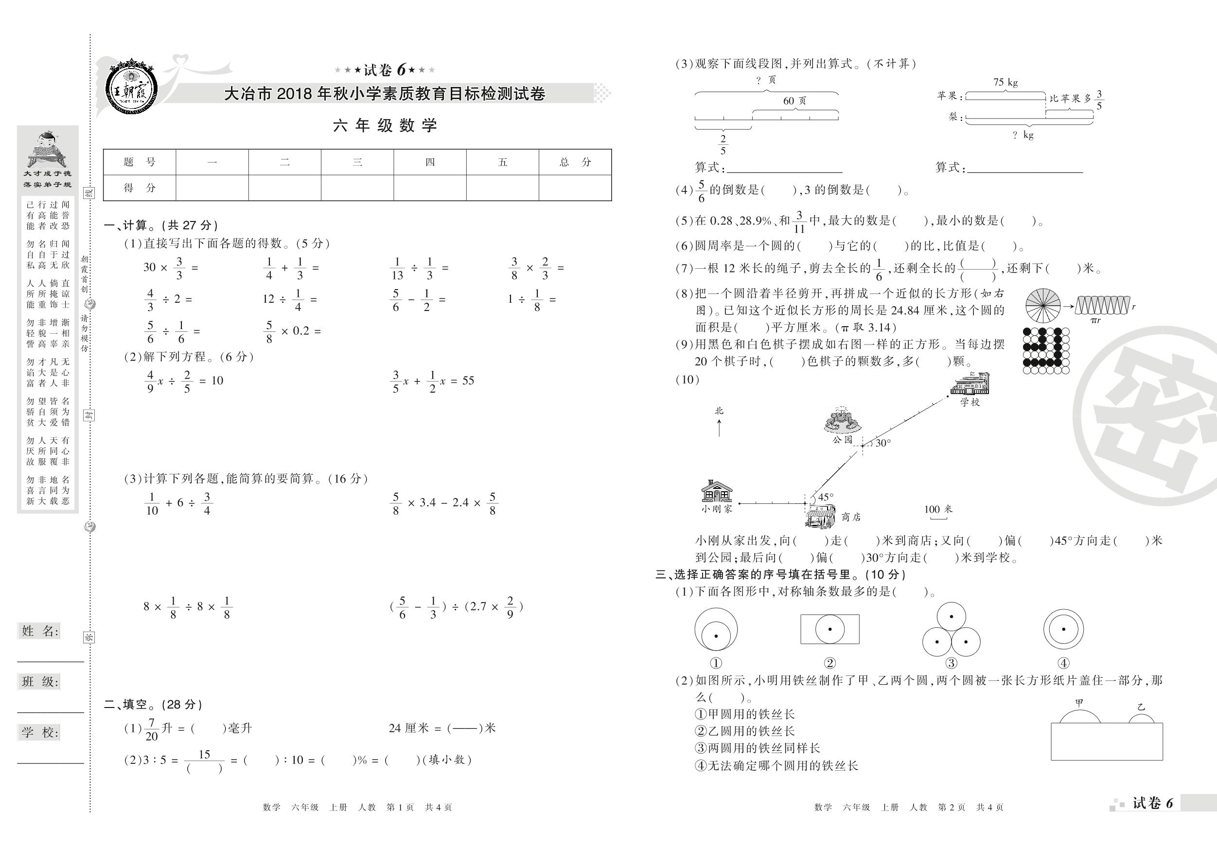 2018-2019学年第一学期大冶市六年级数学试卷(人教版)【6】