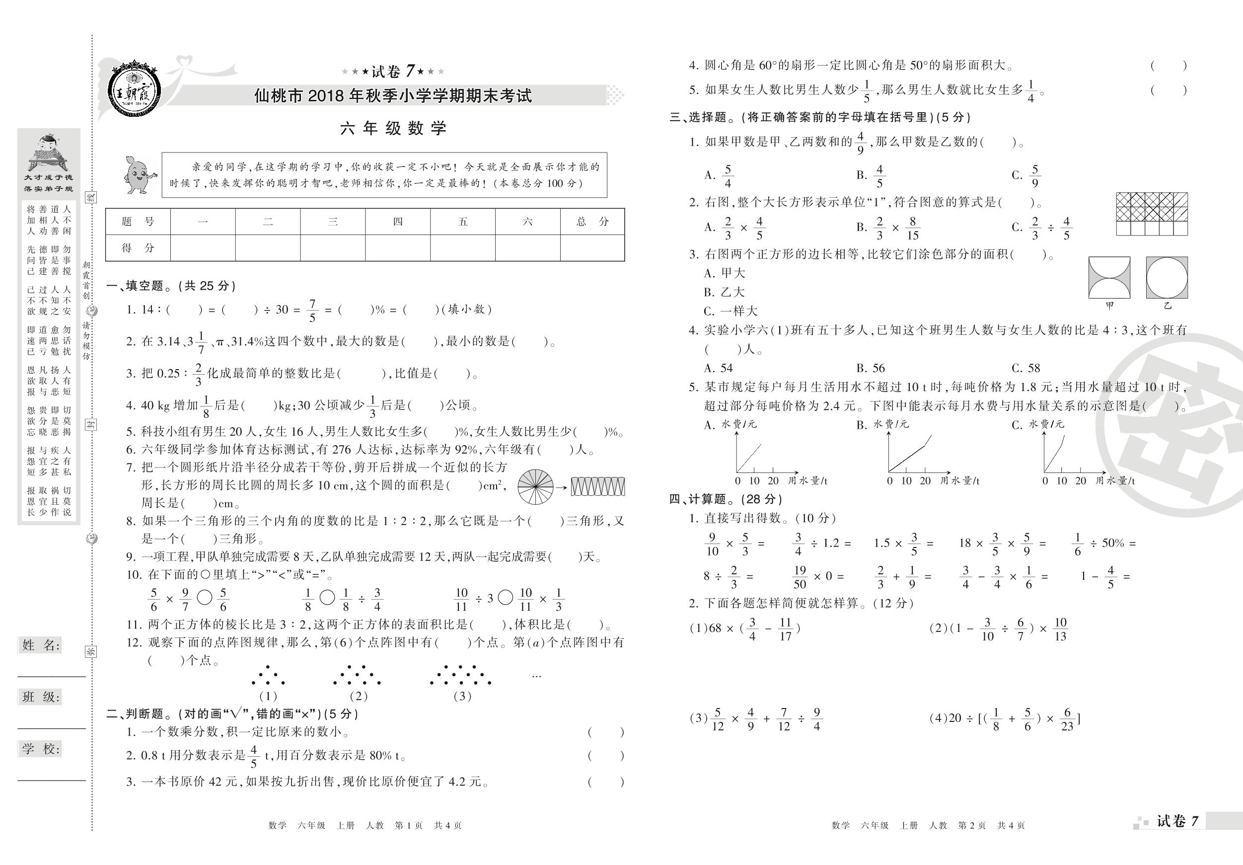 2018-2019学年第一学期仙桃市六年级数学试卷(人教版)【7】