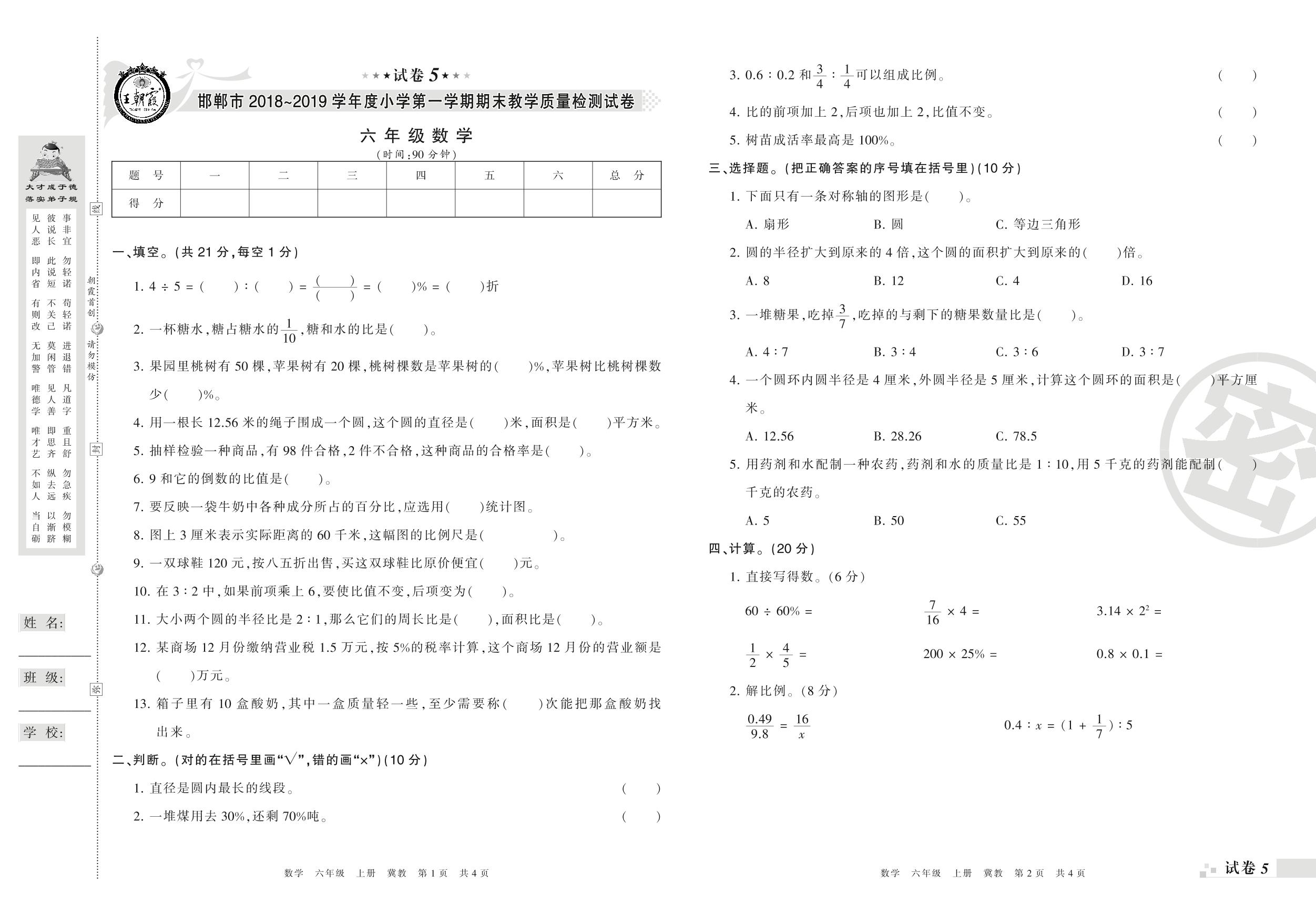 2018-2019学年第一学期邯郸市六年级数学试卷(冀教版)【5】