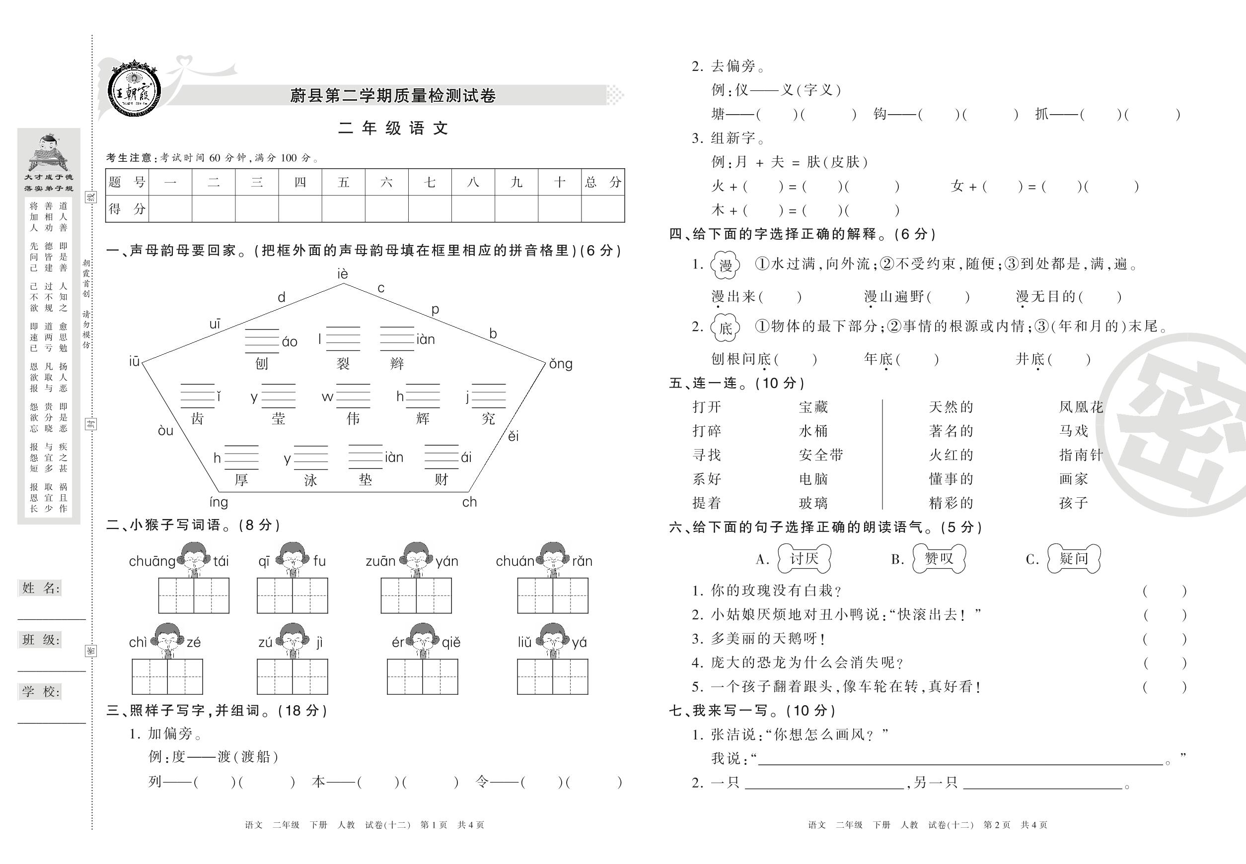 2015-2016学年第二学期张家口市蔚县二年级语文试卷(人教版)【12】