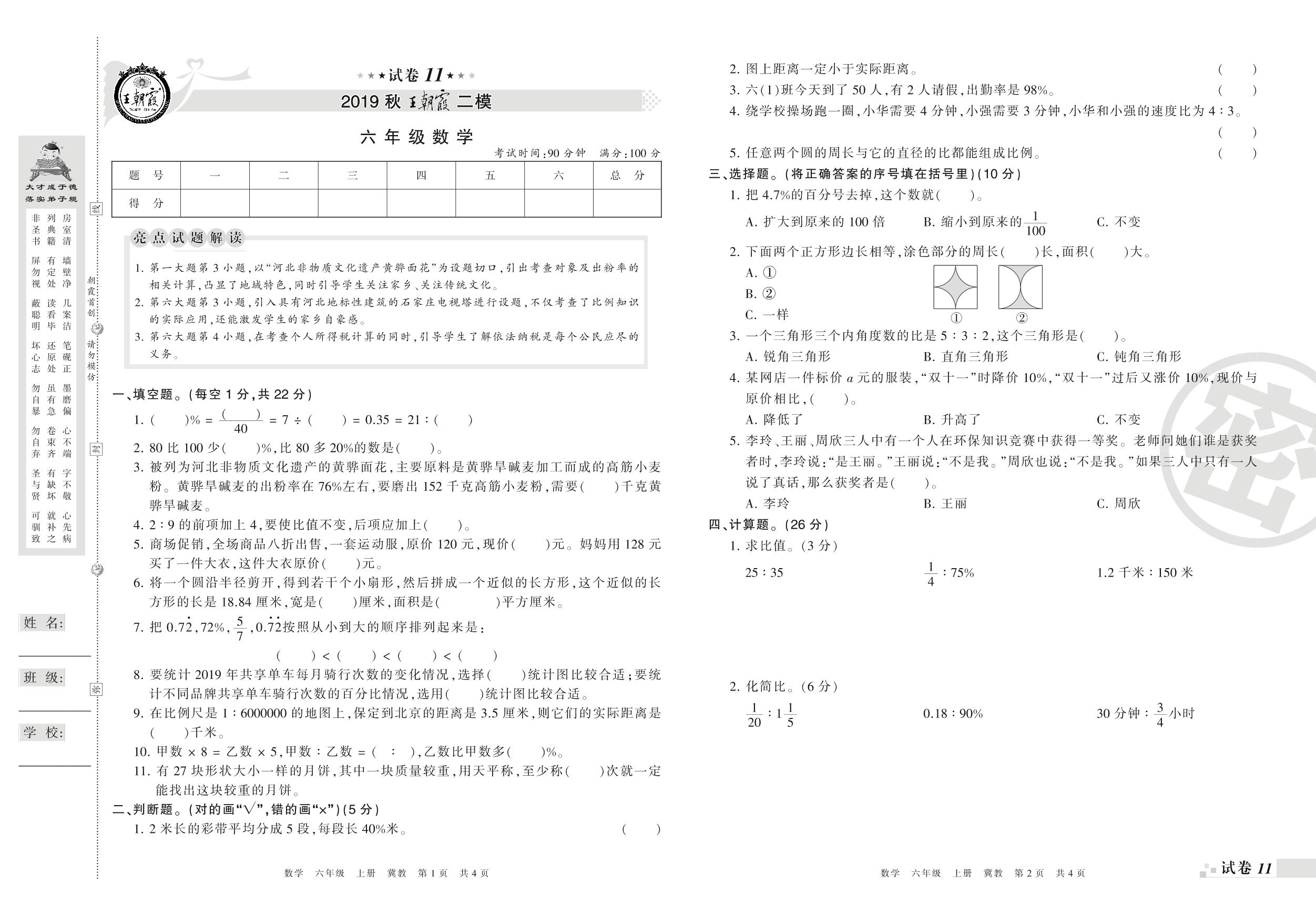 王朝霞期末模拟卷六年级上册数学(冀教版)_R21080595657【11】
