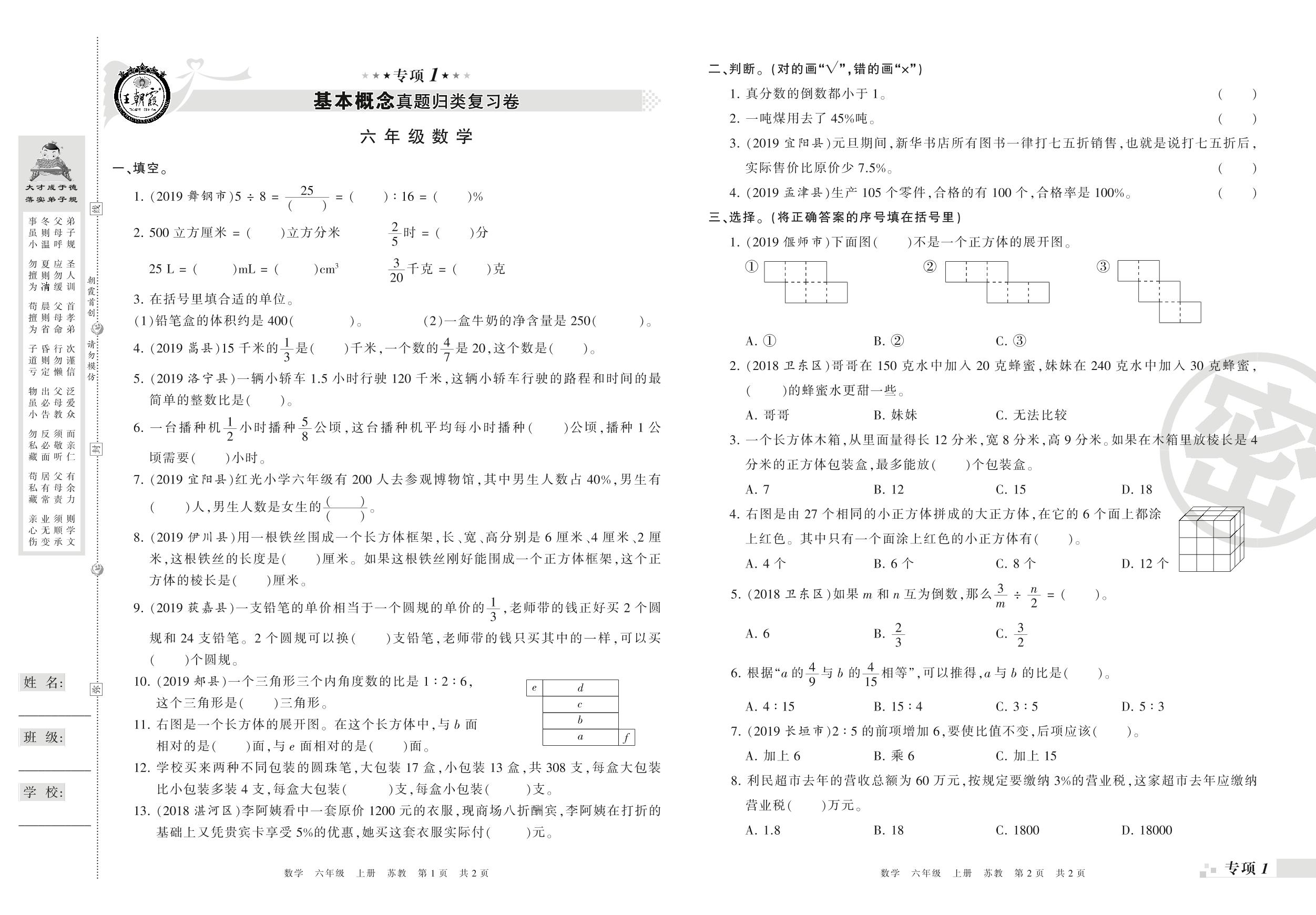 王朝霞期末专项卷——基本概念、计算真题归类复习六年级上册数学(苏教版)_R21080595707【0】
