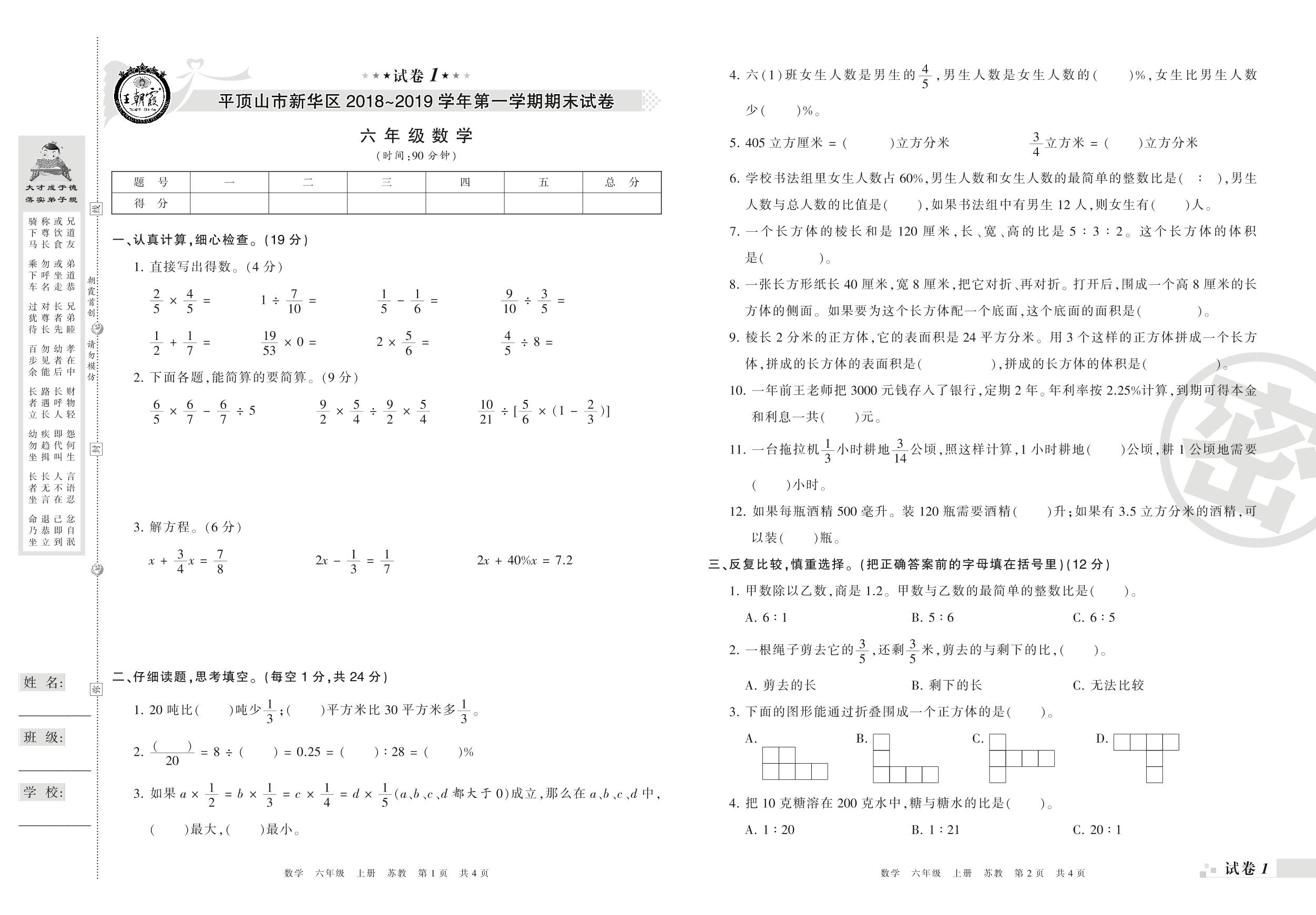 2018-2019学年第一学期平顶山市新华区六年级数学试卷(苏教版)_R21080595712【1】