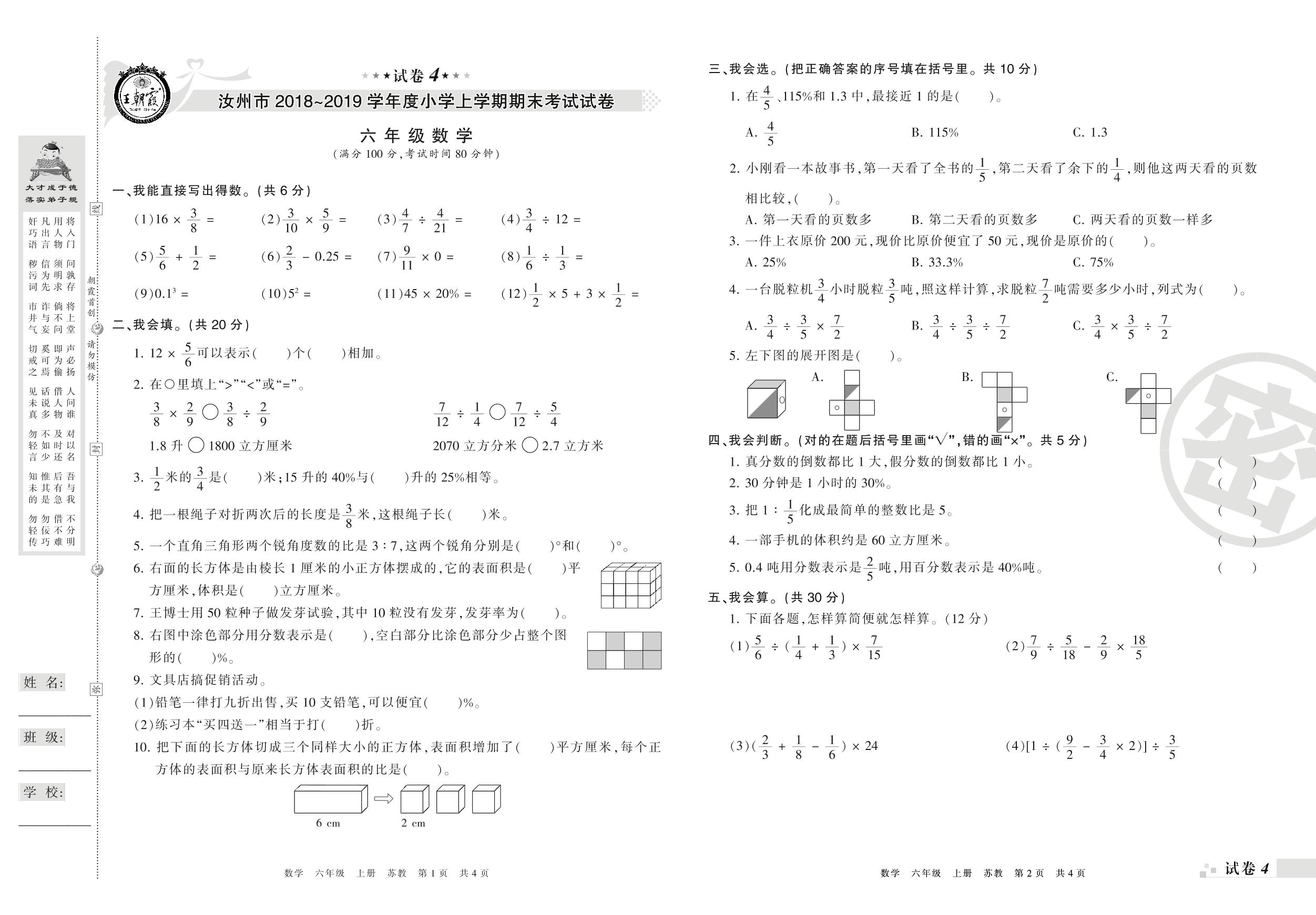 2018-2019学年第一学期汝州市六年级数学试卷(苏教版)【4】