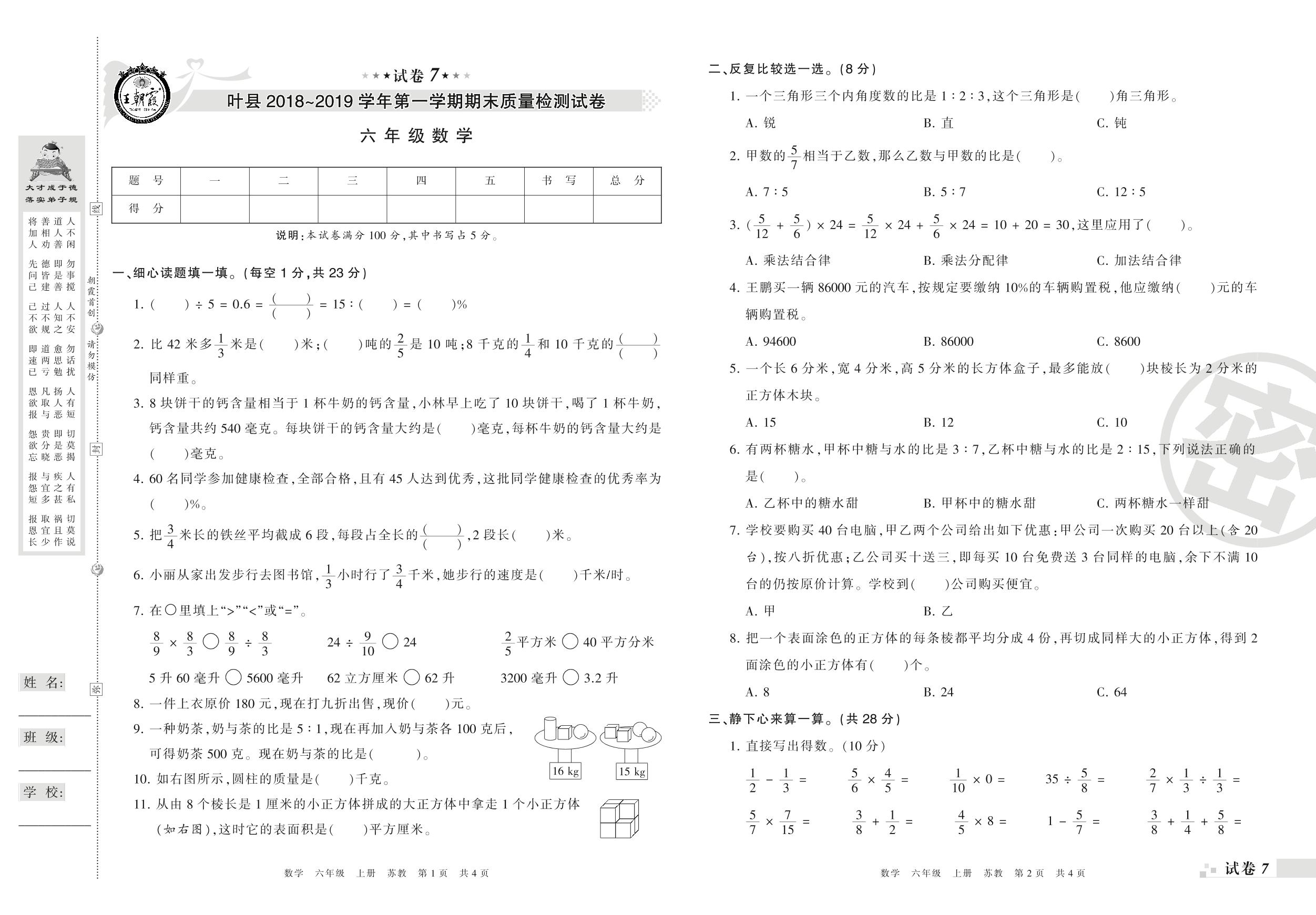 2018-2019学年第一学期平顶山市叶县六年级数学试卷(苏教版)【7】