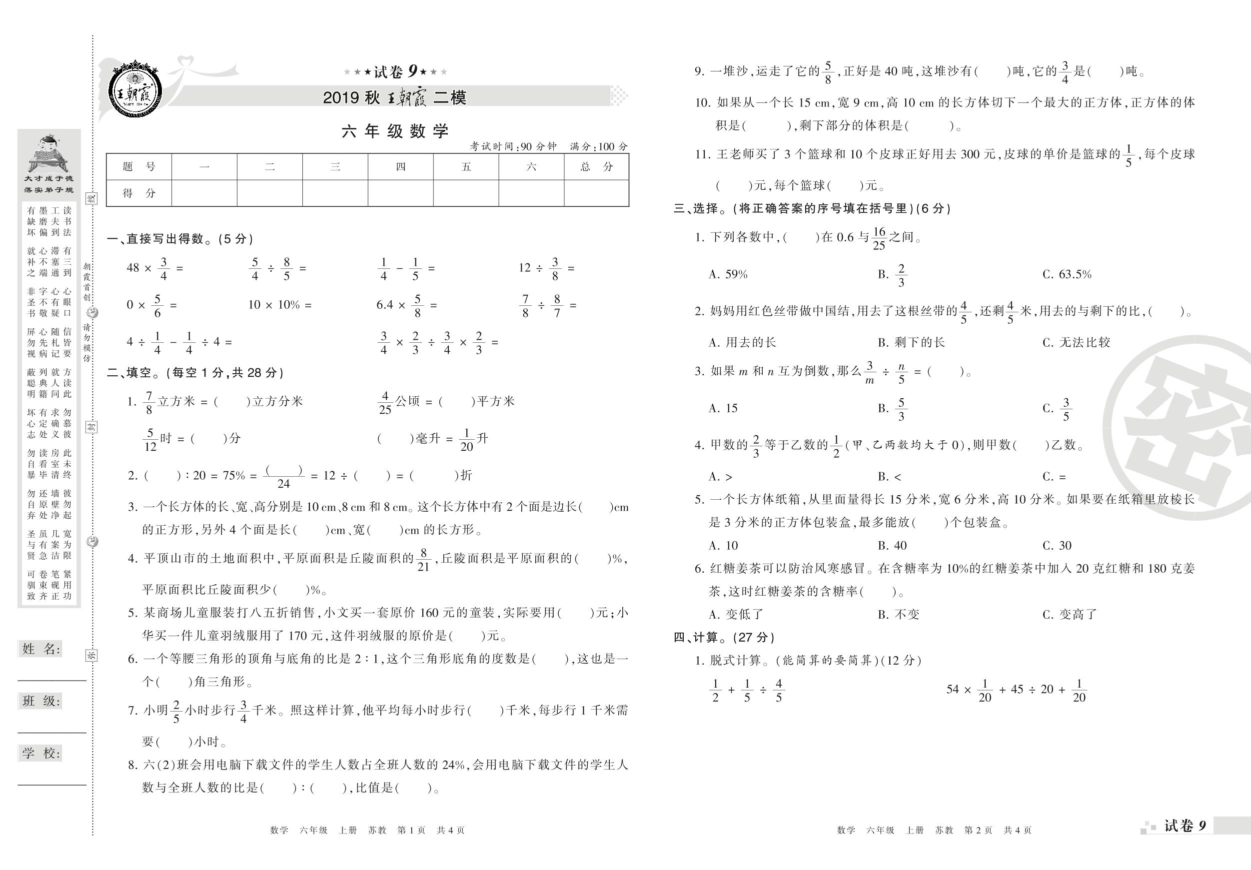王朝霞期末模拟卷六年级上册数学(苏教版)_R21080595732【9】