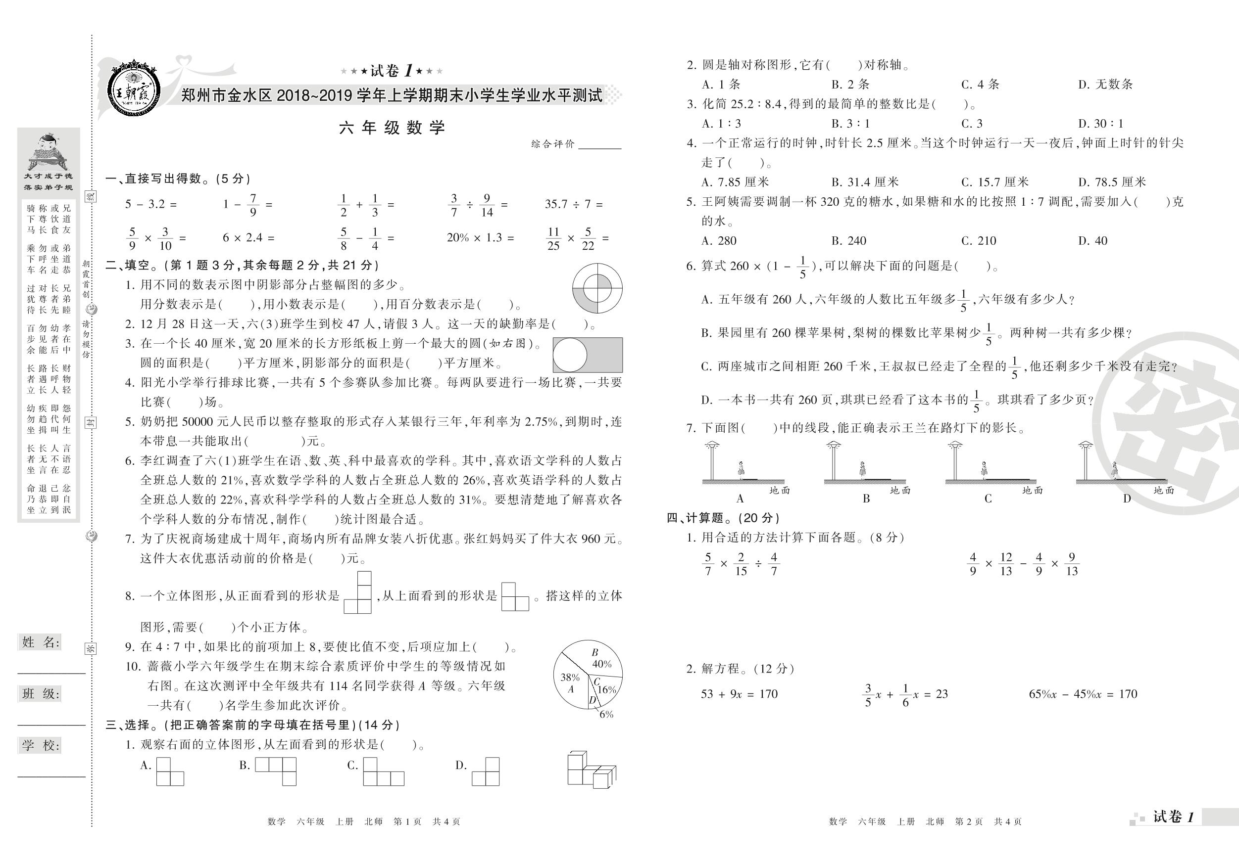 2018-2019学年第一学期郑州市金水区六年级数学试卷(北师版)_R21080595748【1】