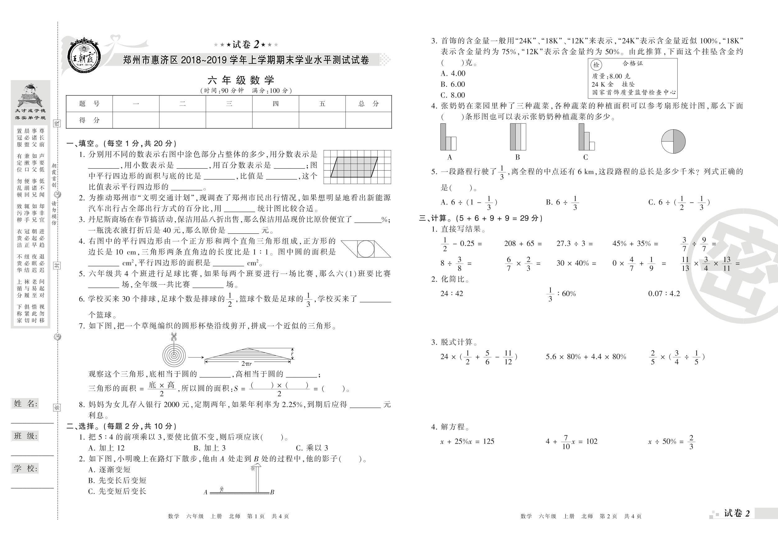 2018-2019学年第一学期郑州市惠济区六年级数学试卷(北师版)【2】