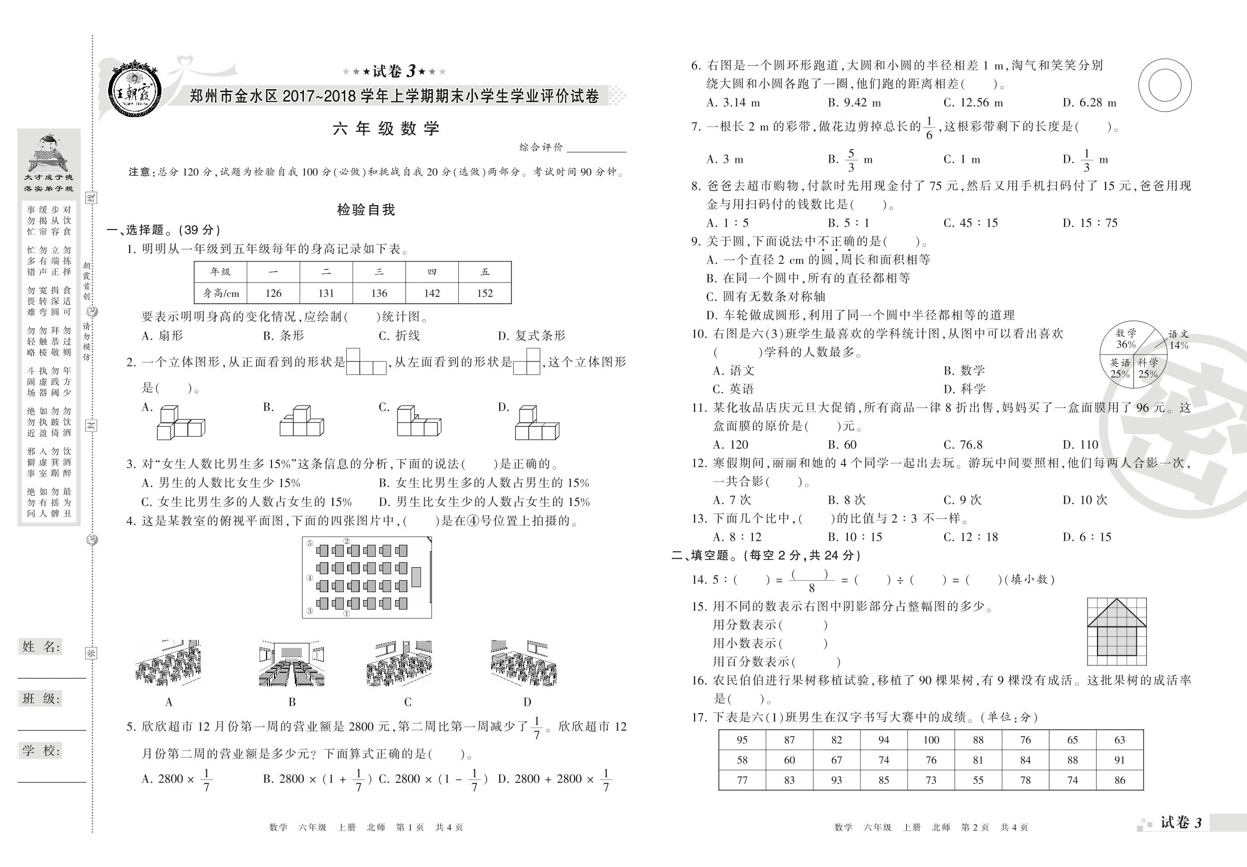 2017-2018学年第一学期郑州市金水区六年级数学试卷(北师版)【3】