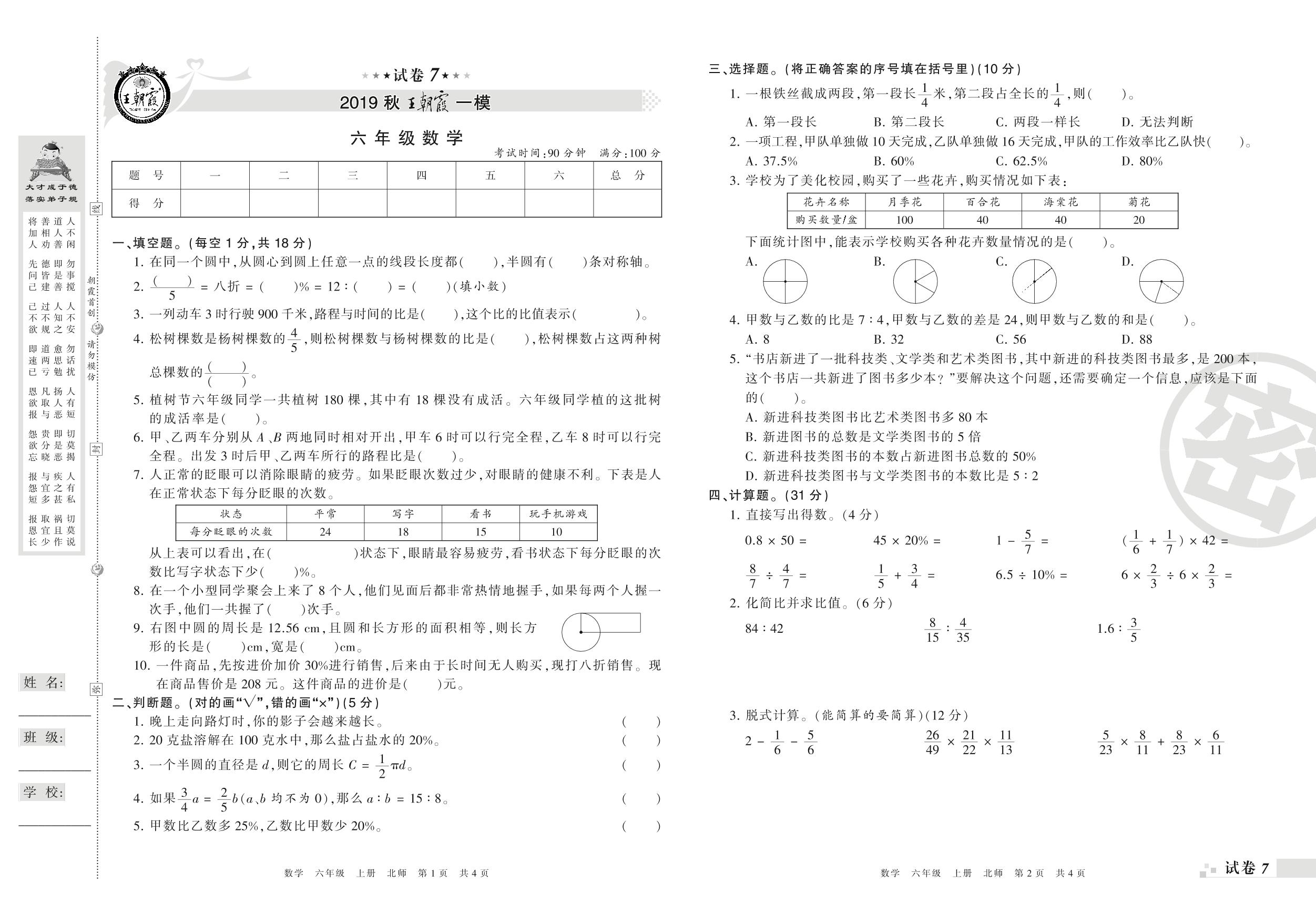 王朝霞期末模拟卷六年级上册数学(北师版)_R21080595806【7】