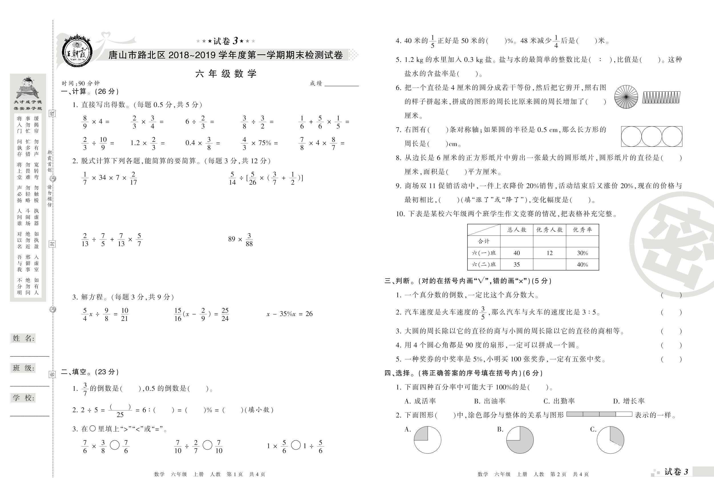 2018-2019学年第一学期唐山市路北区六年级数学试卷(人教版)【3】