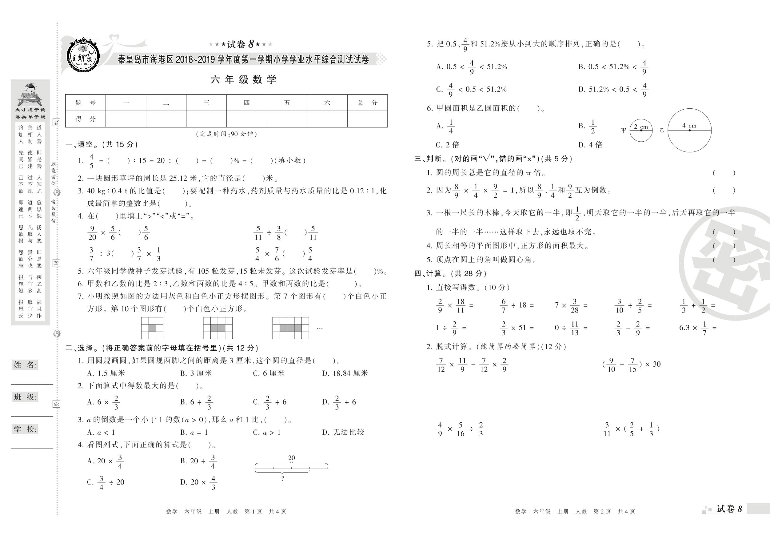 2018-2019学年第一学期秦皇岛市海港区六年级数学试卷(人教版)【8】