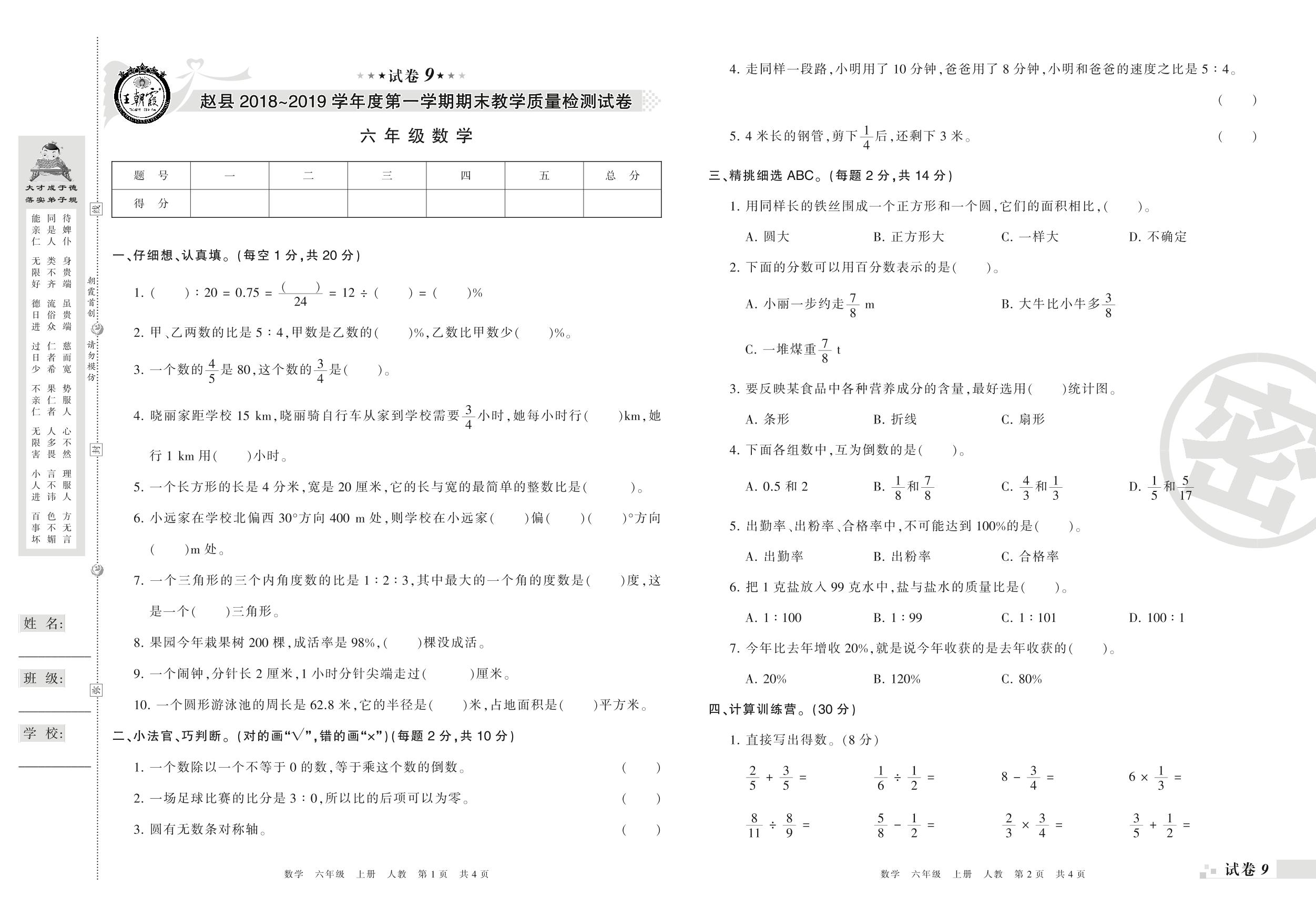 2018-2019学年第一学期石家庄市赵县六年级数学试卷(人教版)【9】