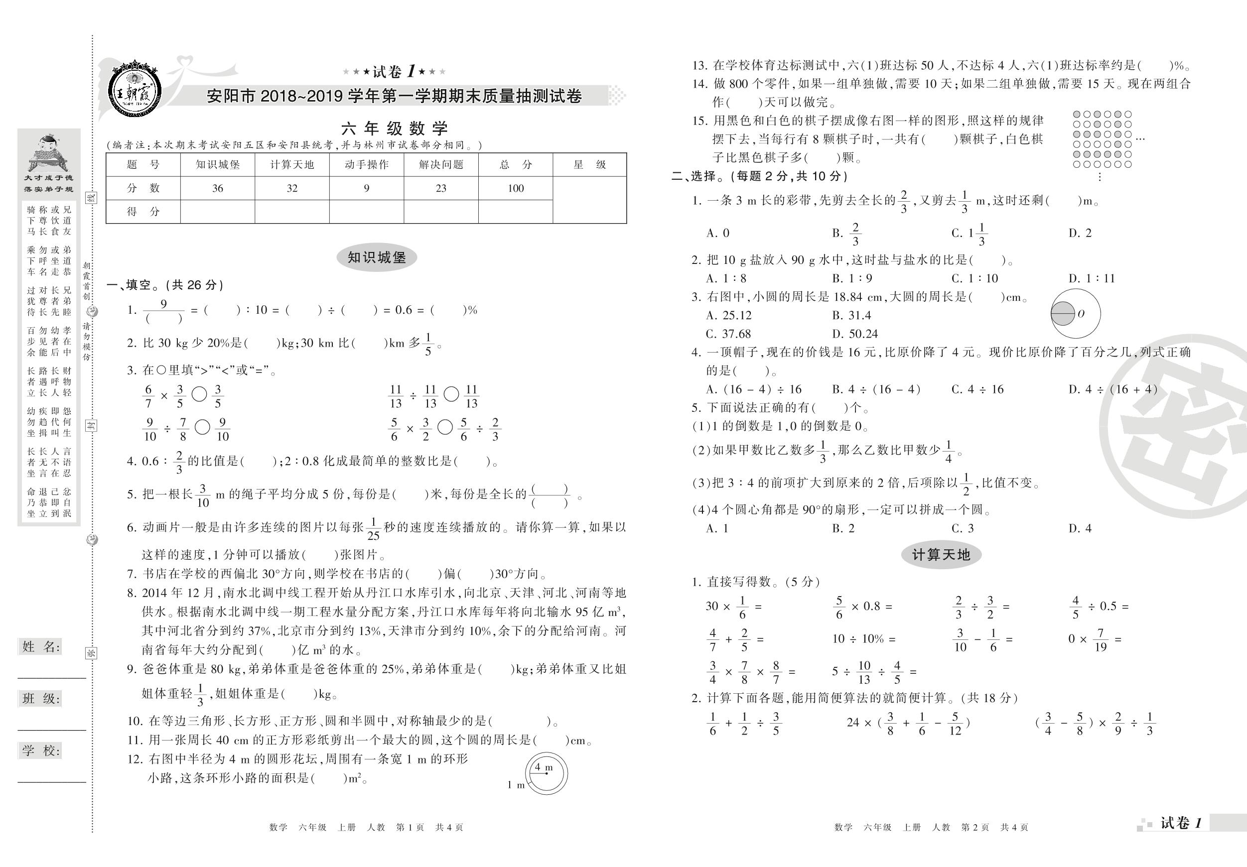 2018-2019学年第一学期安阳市六年级数学试卷(人教版)【1】