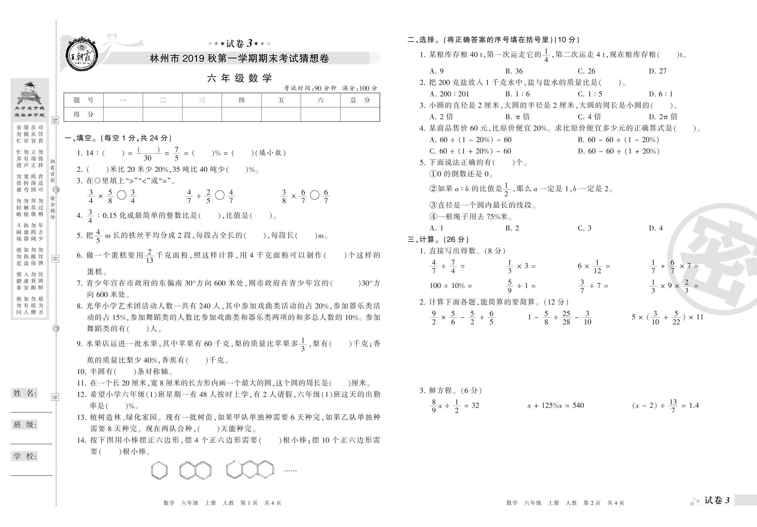 2018-2019学年第一学期林州市猜想卷六年级数学试卷(人教版)【3】