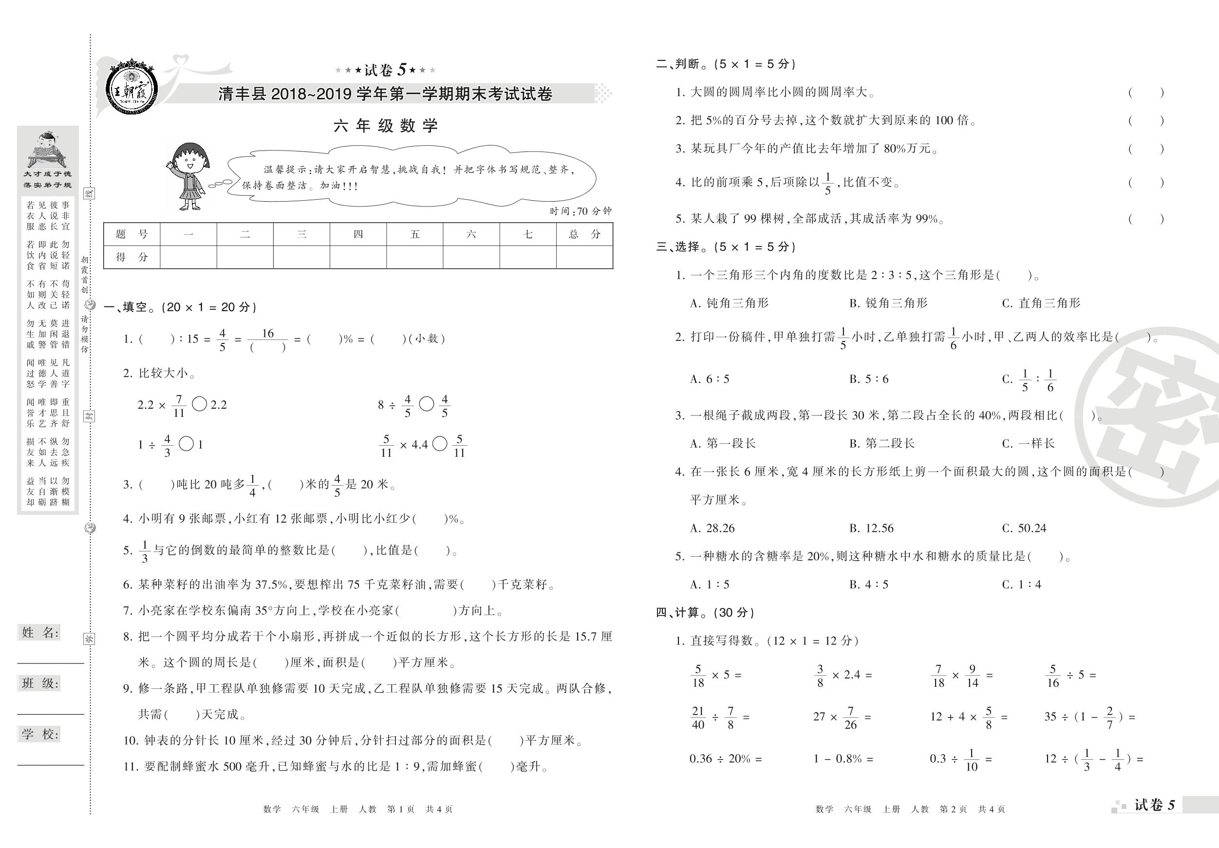 2018-2019学年第一学期濮阳市清丰县六年级数学试卷(人教版)【5】
