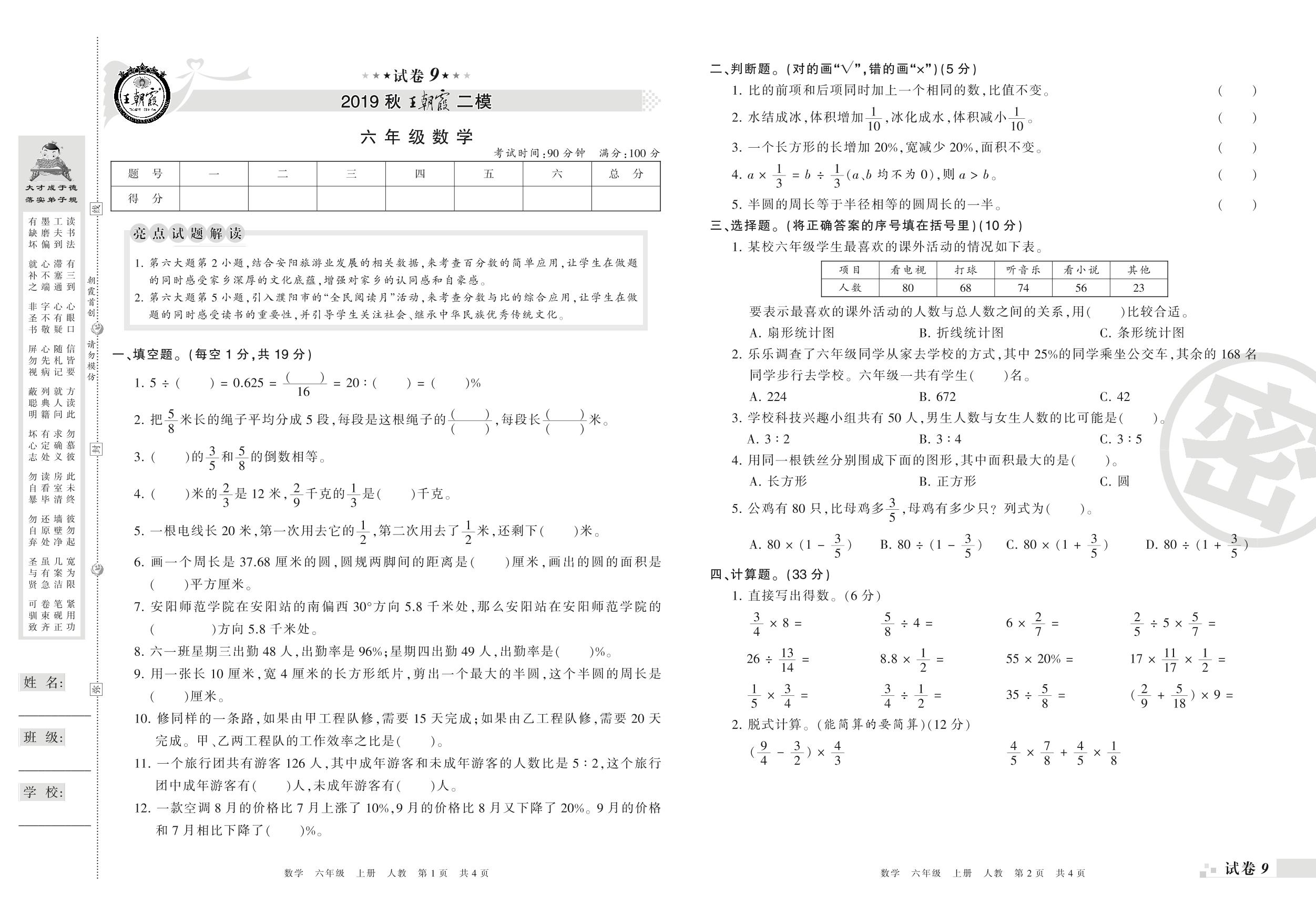 王朝霞期末模拟卷六年级上册数学(人教版)_R21080595934【9】