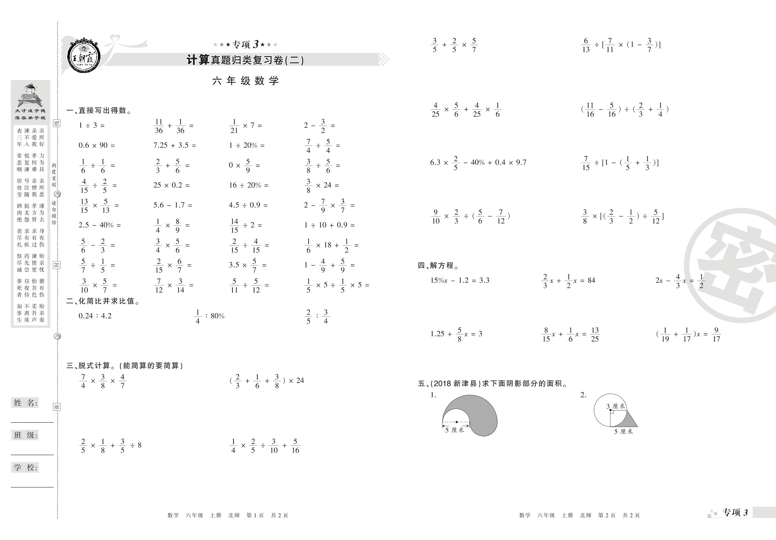 王朝霞期末专项卷——计算、解决问题真题归类复习六年级上册数学(北师版)_R210805100001【0】