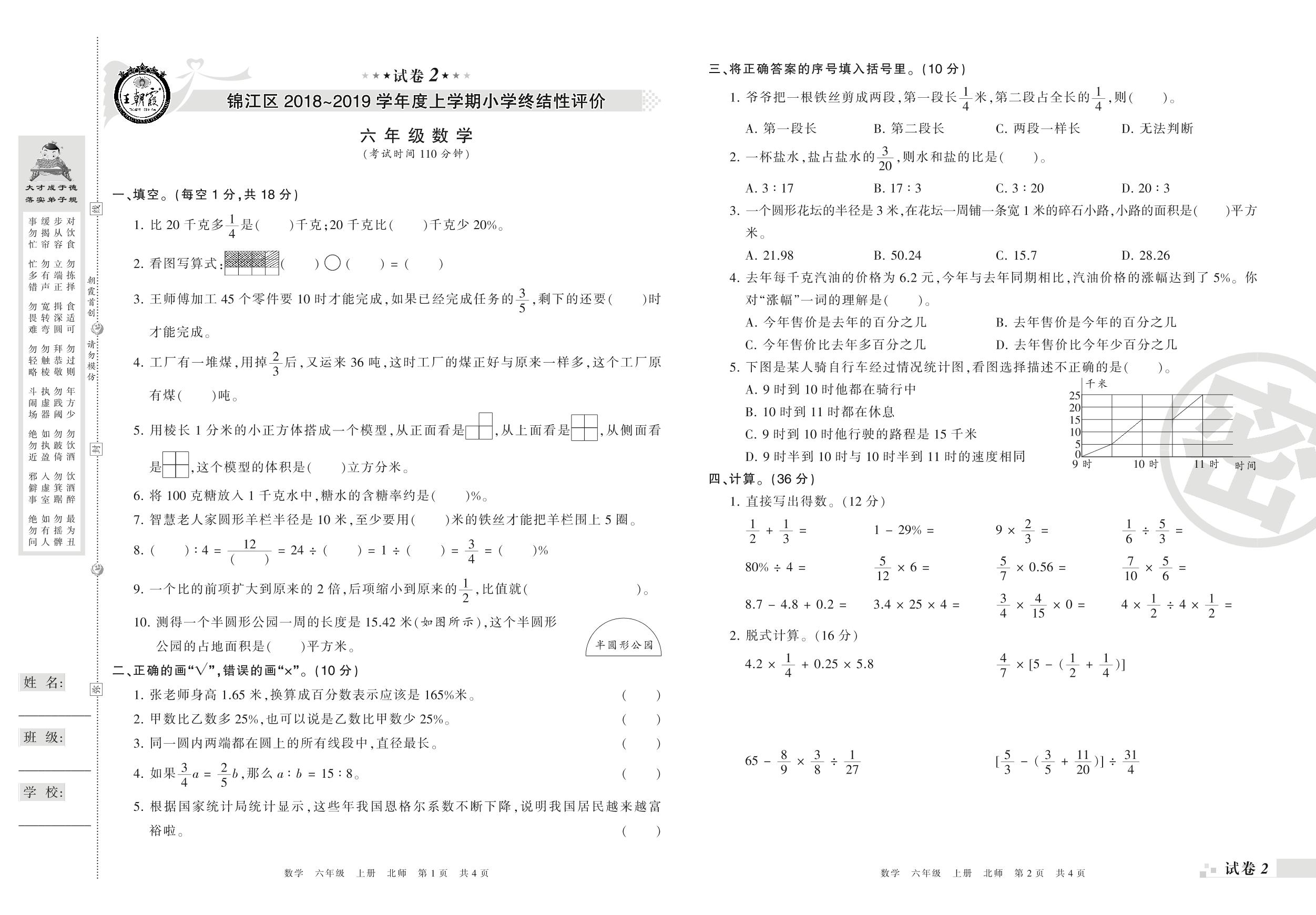2018-2019学年第一学期成都市锦江区六年级数学试卷(北师版)【2】
