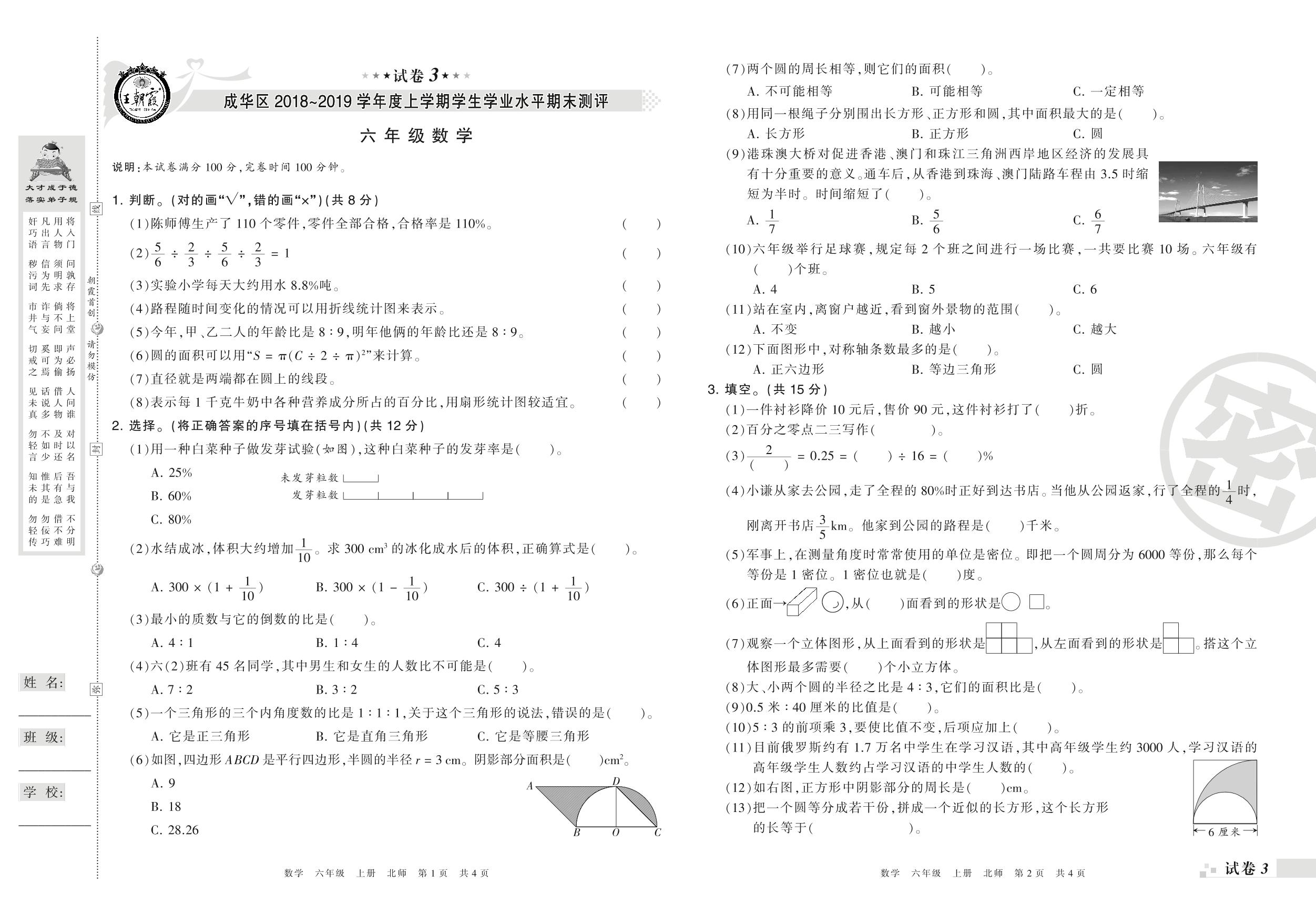 2018-2019学年第一学期成都市成华区六年级数学试卷(北师版)【3】