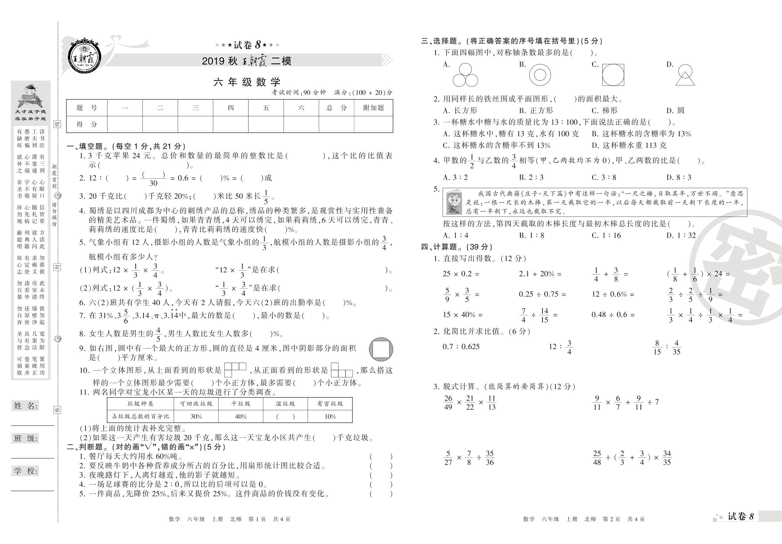 王朝霞期末模拟卷六年级上册数学(北师版)_R210805100103【8】