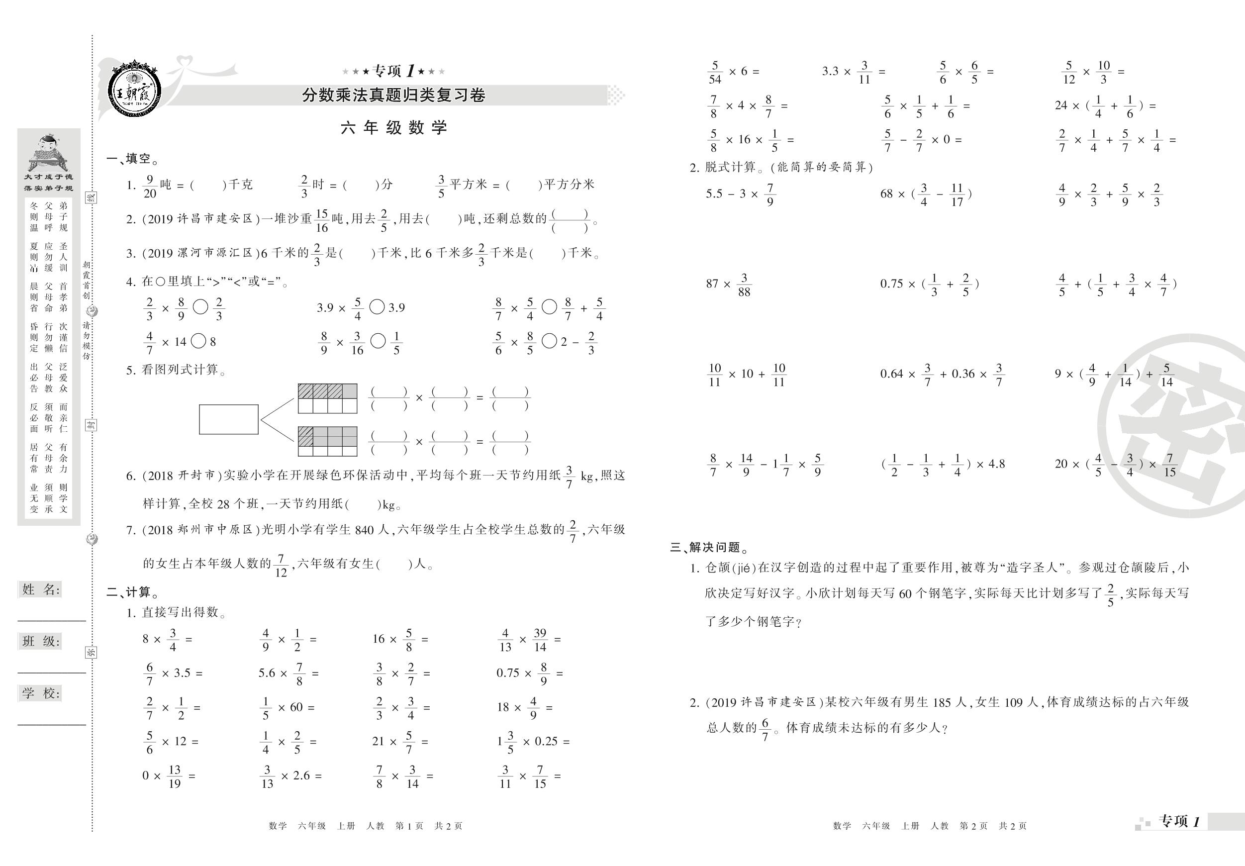 王朝霞期末专项卷——分数乘法、分数除法真题归类复习六年级上册数学(人教版)_R210805100114【0】