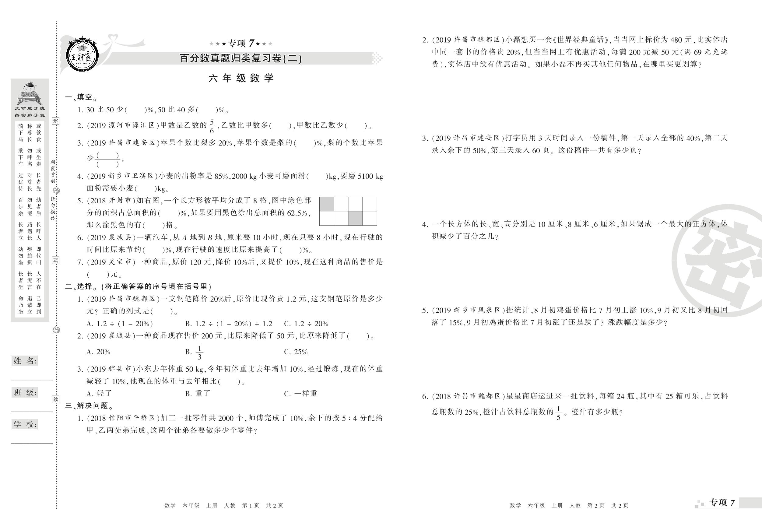 王朝霞期末专项卷——百分数、位置与方向、扇形统计图及数学广角真题归类复习六年级上册数学(人教版)_R210805100122【0】