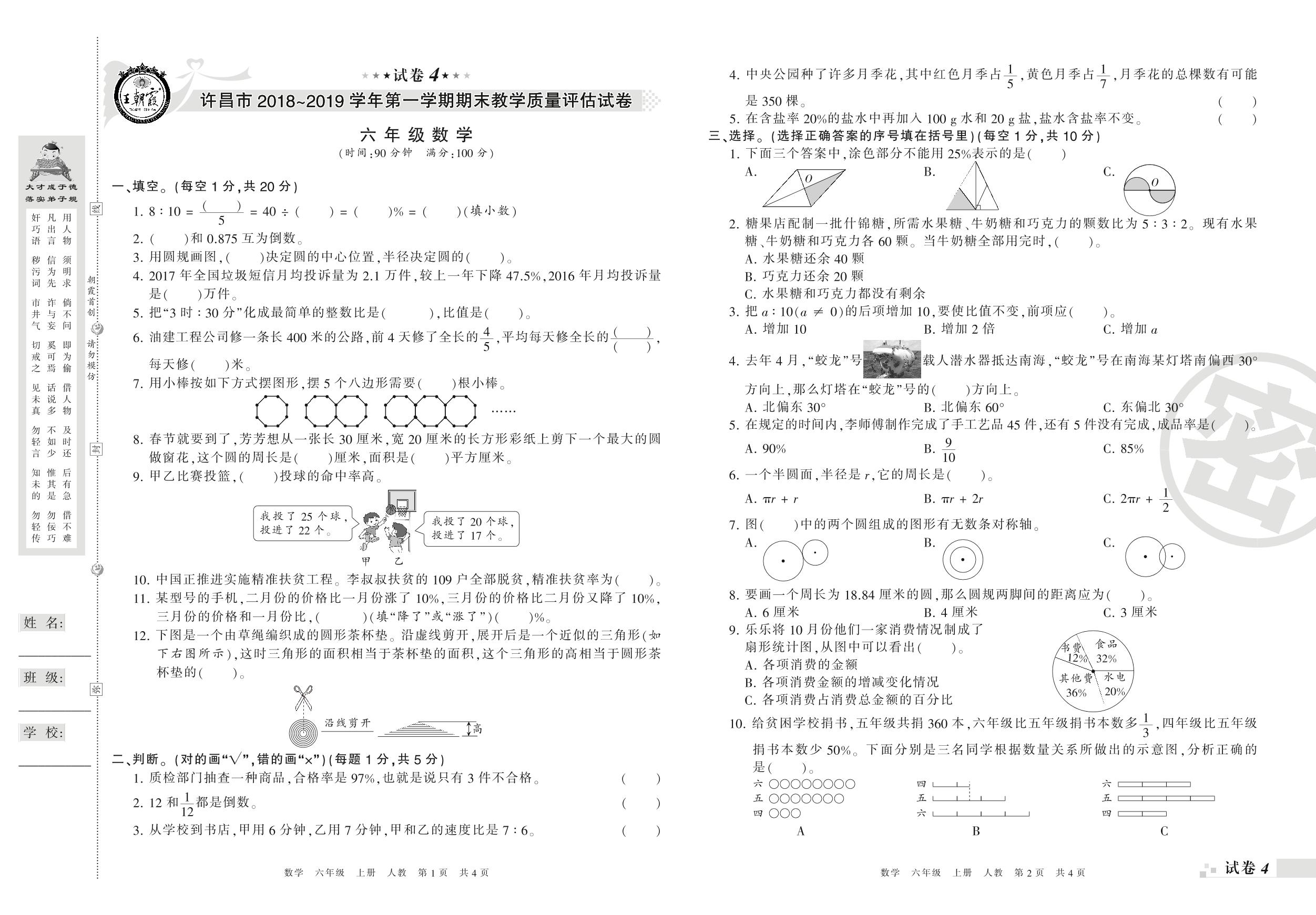 2018-2019学年第一学期许昌市六年级数学试卷(人教版)【4】