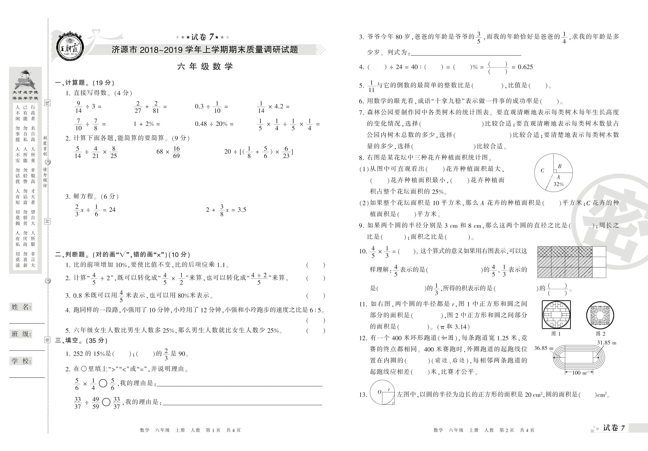 2018-2019学年第一学期济源市六年级数学试卷(人教版)【7】
