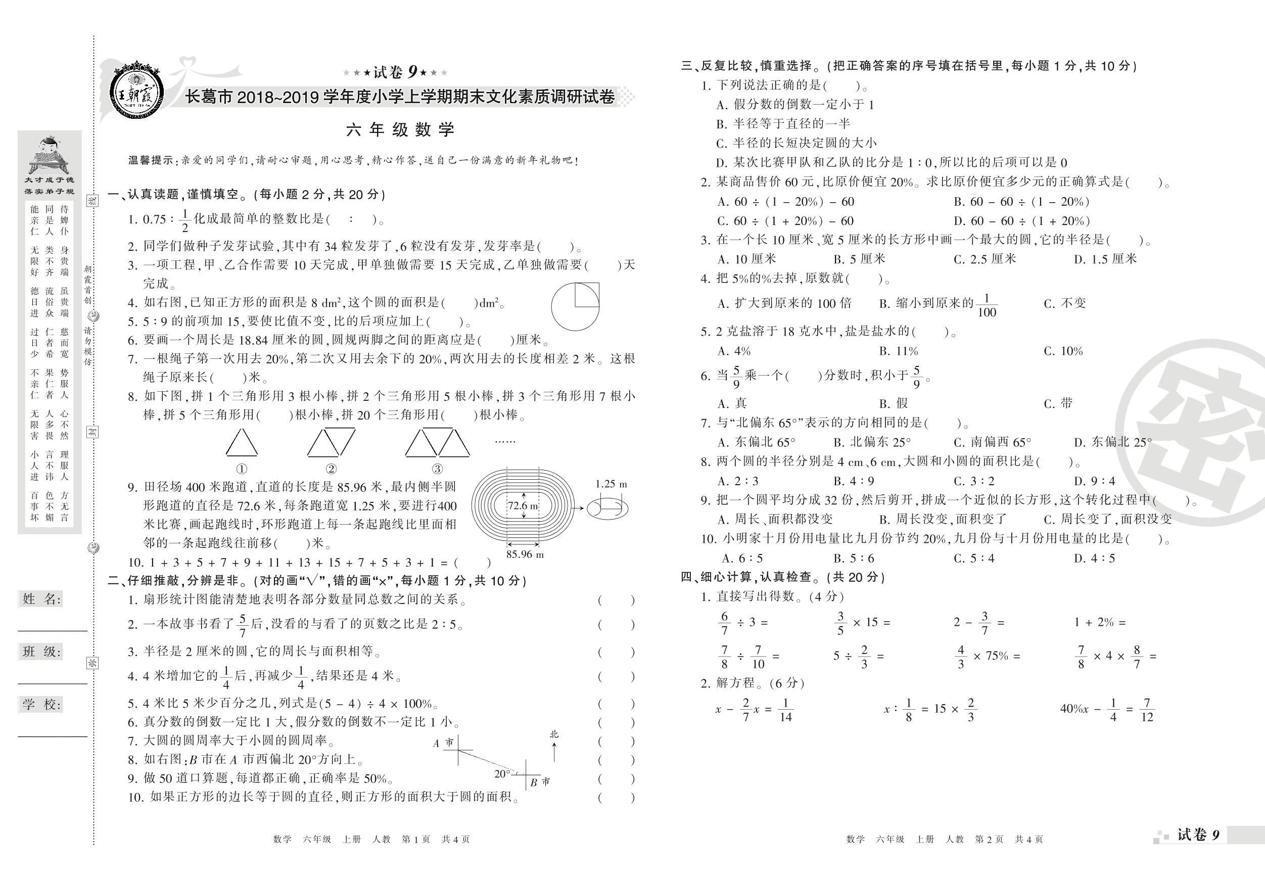 2018-2019学年第一学期长葛市六年级数学试卷(人教版)【9】