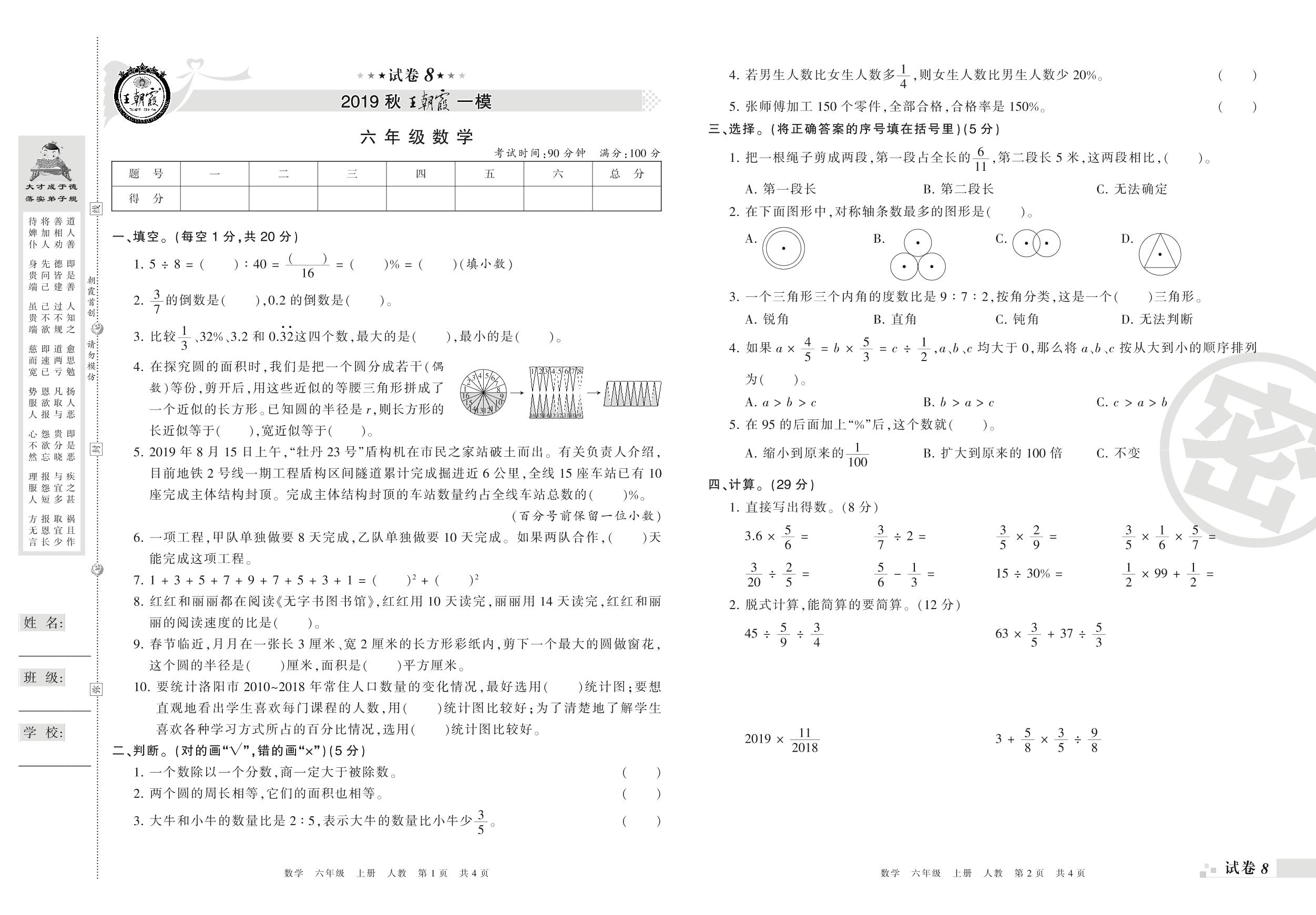 王朝霞期末模拟卷六年级上册数学(人教版)_R210805100234【8】