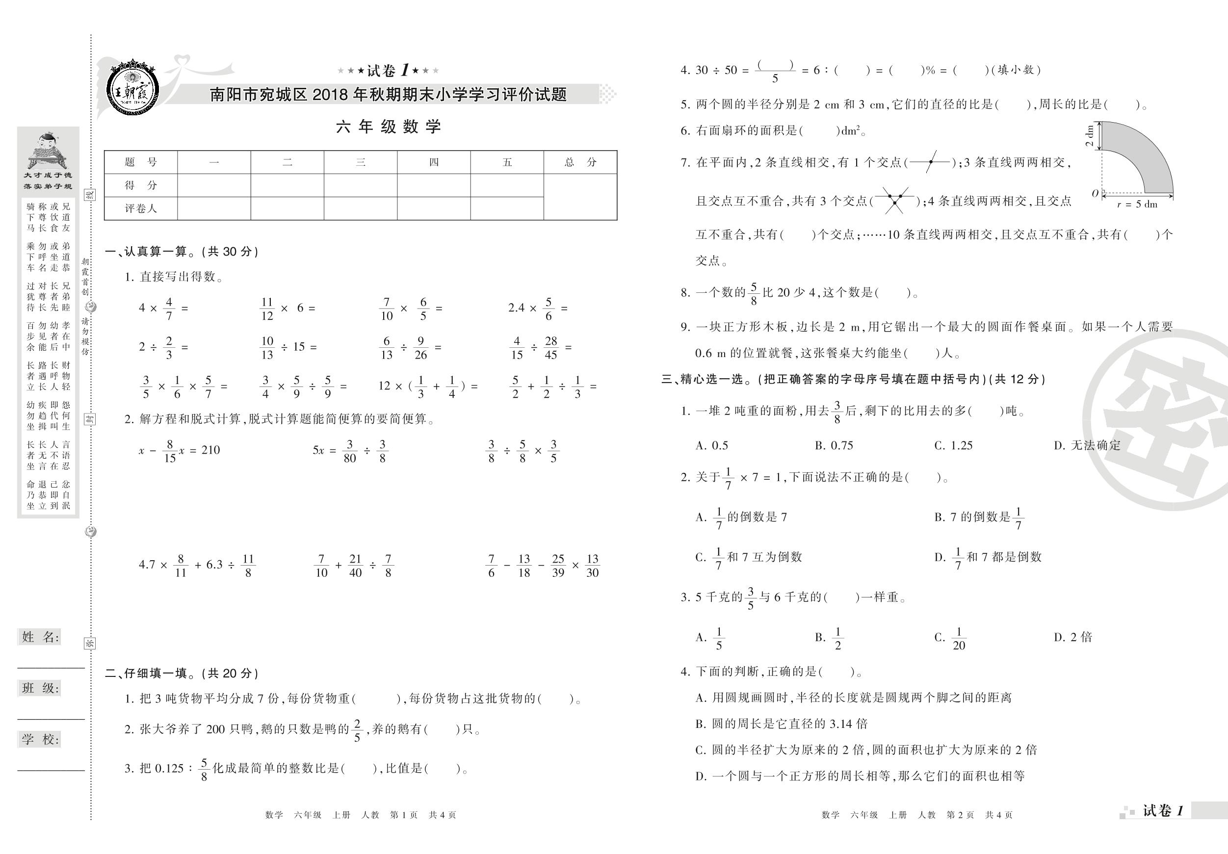 2018-2019学年第一学期南阳市宛城区六年级数学试卷(人教版)【1】
